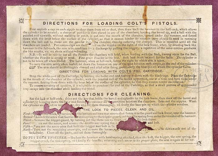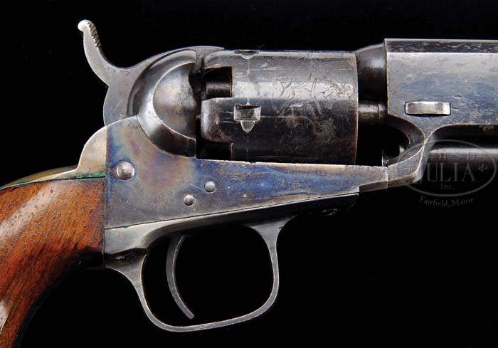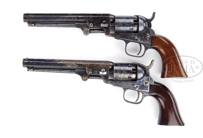 EXTREMELY RARE CASED PAIR OF COLT MODEL 1849 POCKET PERCUSSION REVOLVERS. SN 1) 166126 & 2) 158064. Cal. 31. Both revolvers are identical with 6″ oct bbls, brass pin front sights and 2-line New York City addresses. Left sides of frames are marked “COLTS PATENT” and they have silver-plated large brass trigger guards & backstraps containing 1-pc walnut grips. They have 5-shot cyls with stagecoach holdup scene. They are accompanied by an orig mahogany dbl casing with purple velvet lining and has a directions label inside lid. Bottom is compartmented in bottom for revolvers, a sgl-sided “COLTS PATENT” American eagle flask, a blued steel 2-cavity bullet mold with “COLTS PATENT” sprue cutter and marked on right side “31 PKT”. Also accompanied by an L-shaped nipple wrench, a lacquered tin of Eley’s caps and a packet of six combustible cartridges. Front of case has a mortised brass lock with brass shield escutcheon. Any cased Colt is a scarce item with dbl casings extremely rare. CONDITION: 1) Very fine, all matching including wedge & grip. Bbl retains about 70% glossy orig blue with balance flaked, not worn, to a dark patina. Rammer & handle retain about all of their brilliant case colors. Frame retains about all of its brilliant orig case colors. Hammer retains traces of case colors being mostly a gray patina. Wedge appears to have had its ends dressed along with the wedge screw. Trigger guard & backstrap retain about all of their orig silver-plating. Cyl retains about 70% glossy orig blue with balance flaked to a medium patina with a couple of spots of light pitting and four of five safety pins are prominent. Grip is sound with minor handling marks & retains most of its orig varnish. Mechanics are crisp, bright shiny bore with scattered light pitting. 2) Very fine, all matching including wedge & grip. Bbl retains 88-90% glossy orig blue with balance flaked to a medium patina. Rammer & handle retain faded case colors, bright on pivot. Cyl retains 85-90% glossy orig blue mixed with flaked patina and about 98% stagecoach holdup scene. All five safety pins are prominent. Frame & hammer retain about all of their orig case colors, strong & bright on sides of frame, slightly faded on recoil shields & hammer. Trigger guard retains virtually all of its black oxidized silver-plating while backstrap retains silver-plating in sheltered areas, being mostly a medium mustard patina. Grip has chipped right toe otherwise is sound with light nicks and retains most of its orig factory varnish. Mechanics are crisp, strong bore, dark in the grooves. Case is completely sound with light handling & storage marks and retains most of an old wiped-on light finish. Interior is moderately faded & soiled with a couple of small spots missing from label inside lid. Flask is fine with two or three very small dents and retains about 75% orig finish. Mold is fine with right side somewhat battered and overall retains about 60% orig finish. Cap tin & cartridge packet are fine. 4-37548 JR256 (12,500-17,500)