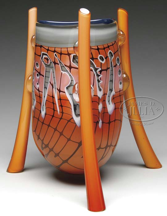 JANICE ENNS & JOHN LEIGHTON VASE. Very interesting collaboration of these artists creates a three sided freeform vase in peach shading to pink glass with a brown fishnet pattern and a wide gray band at the lip. Vase has a center pattern of clear glass random shapes showing a background of gray glass with matching fishnet pattern. Vase is finished with three hollow glass tube legs attached with glass wafers. Signed on the underside “Janice Enns and John Leighton ’88 TP6-II”. SIZE: 13-1/4″ t. PROVENANCE: From the Collection of Dr. & Mrs. Ivan Cohen. CONDITION: Very good to excellent. 5-62870 (800-1,200)