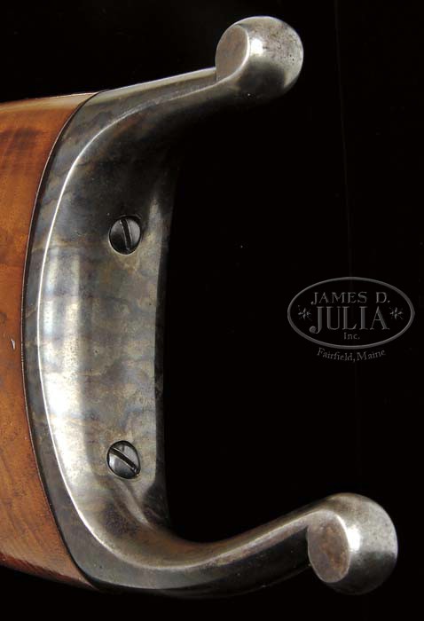*STEVENS IDEAL “SCHUETZEN SPECIAL” RIFLE NO. 54 ON 44-1/2 ACTION WITH ORIGINAL SCOPE. SN 10782. Cal. 32-40. 30″ Half round half octagon bbl is stamped “J. Stevens A. & T. Co.” “Chicopee Falls, Mass. U.S.A.” and with caliber on either side of top flat, which is mounted with scope blocks. There is no provision for front sight. Bottom of bbl is stamped with SN and “10” under forend. Front face of case hardened 44 -1/2 action is stamped “54” “0” and “EX”. Action has all correct features of this model including special, long grip, finger lever, double set triggers, and considerable engraving. Engraving consists of large shaded scroll outlining circular vignettes of game; a bear on left, and a stag on right. Nicely crotch figured American walnut buttstock has heavy double hooked Schuetzen buttplate with large right hand cheekpiece, and 20 LPI checkering with fancy border. SN is on action tang. Matching Schnabeled tip forend attaches with two screws and is fitted with correct palm rest. Scope marked with J. Stevens name and address, along with “Pat. Pndg.” stamped in with no. “474” is in micrometer rear mount and sliding front. CONDITION: Excellent, near new. Bbl retains 98% orig blue. Action retains nearly all its orig case hardening color, browned slightly on top tang. Bright blue of breech block shows some wipe marks. Triggers and hammer retain nearly all of their blue. Stocks retain nearly all of their orig finish, with a few minor marks, and isworn through on sharp edges. Bore is excellent, bright and shiny throughout. Action is crisp. Set triggers work. Scope retains nearly all of its blue, tube shows some dimples and marks, optics are clear. An exceptionally fine example of this top-of-the-line target rifle. 4-45121 MGM250 (6,000-10,000)