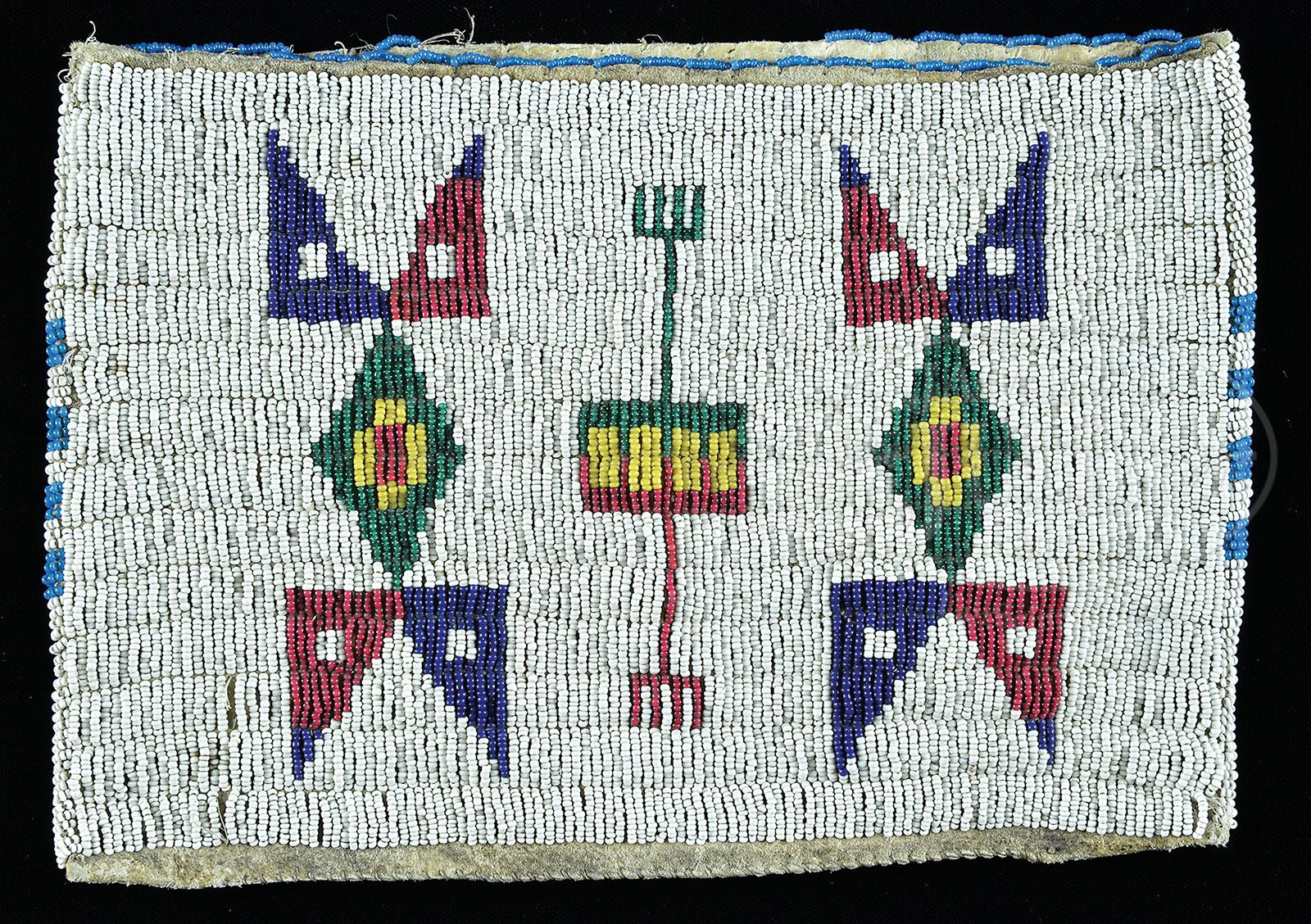 NATIVE AMERICAN BEADED POUCH. Geometric pattern on a white ground in colors of cobalt, red, green, and yellow. One side decorated, the other not. SIZE: 6-1/2″ x 9-1/2″. CONDITION: Beadwork intact, possibly fashioned from a larger piece. 9-90010 (1,000-2,000)