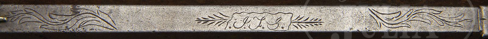 RARE PERCUSSION KENTUCKY PISTOL MADE BY HUNTINGDON COUNTY GUNSMITH JACOB FRANKLIN GEHRETT. SN NSN. 10-1/2″ full oct .38 Cal rifled engraved bbl which is signed “J.F.G.”. Bbl tang runs 4-1/2″ down wrist and engraved percussion lock is faintly marked “JFG”. Stock is decorated with 10 silver inlays and has an iron trigger guard and pewter nosecap. Pistol has double set triggers. 1-screw brass sideplate is nicely engraved. Jacob Gehrett worked as a gunsmith in Todd Township, Huntingdon County in 1850 and 1860 afterwhich he relocated to Orbisonia, Huntingdon County. It is very unusual and difficult to locate a Huntingdon County signed Kentucky pistol. PROVENANCE: Frank Sujansky Collection. CONDITION: Lock is not working and needs adjustment. This pistol is in orig condition showing only normal wear from age. 4-49488 RG48 (3,500-5,500)