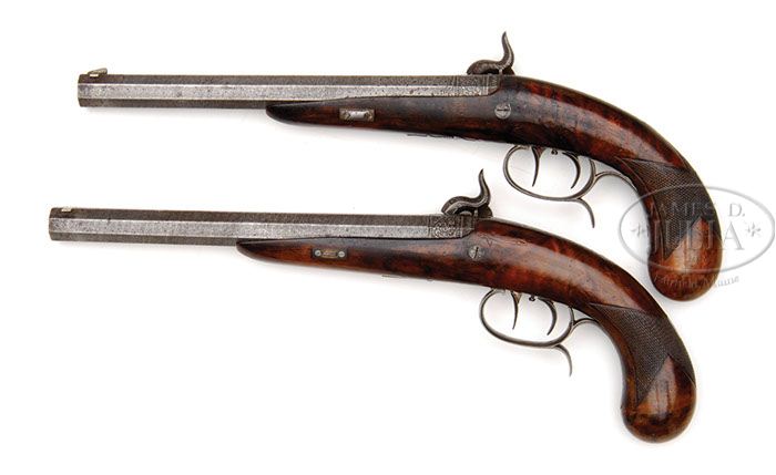 CASED PAIR PERCUSSION TARGET PISTOLS BY H. L. RASCH. SN NSN. Cal. .510. 10″ Unmarked octagon fine etched Damascus bbls are fitted with scroll engraved breech plugs with large bolsters. Breech irons have V-notch rear sights with elevation screws, and are scroll engraved. Back action locks with flat-faced serpentine hammers have pivoting safeties mounted in front that engage breasts of hammers. Spurred trigger guards have pineapple finials. Trigger plates are fitted with double set triggers. All metal parts are engraved with very well cut, large, open, shaded scroll with stippled background. A boar’s head is on each bolster, and “H. L. Rasch” (Heinrich Ludwig Rasch of Braunschweig 1818 – 1884) is in arched device behind each hammer. Burl figured European walnut stocks with checkered bag grips, attach to bbls with side nails through rectangular German silver escutcheons. There are truncated rectangular silver plates on backs of grips engraved “v L” with numbers “1” and “2”. Oak case with sliding bolt and key lock closure has inset brass corners and central medallion. Interior is lined in dark blue coarsely woven cloth, and contains a steel ramrod, bag shaped copper bodied powder flask, tin of Ely caps, and what appears to be original nutcracker type round ball mold marked “No 45″, with nipple wrench on one arm. CONDITION: Very good, as found. Metal parts are silver gray. Stocks retain most of their orig French polish finish, darkened where worn through. A 1” crack on gun no. “1” runs from rear lock to checkering. Rifled bores are good, needing cleaning. Locks are crisp. Triggers of gun number one do not set. Safety swivel is broken on gun no. 2. Case is fine, retaining much of its orig finish. Interior cloth is fine, but dirty. Mold is rusted. Flask is considerably tarnished. An interesting pair of pistols by this little known, but excellent quality maker. 4-46273 MGM257 (4,000-5,000)