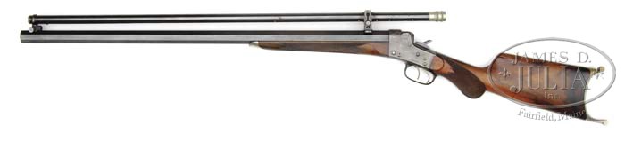 RARE REMINGTON HEPBURN NO. 3 SINGLE SHOT SPORTING & TARGET RIFLE. SN 5771. Cal. 44 2-4/10″ (Probably a 44 2-6/10″ Remington straight). Beautiful target rifle with 30-1/4″ medium weight oct bbl, no sights, mounted with a 33″ Malcolm scope in target mounts with German silver ends. Receiver has dbl set triggers. Rifle is mounted with very nicely figured French or English walnut with checkered forearm that has a nickeled metal semi-schnable tip and rnd knob stock with nickeled brass Swiss buttplate. Receiver has usual patent markings on left side and bottom flat of bbl, above forearm has the caliber marking. SN is found on lower tang, bottom of bbl under forearm, rear face of forearm, front face of buttstock and inside toe of buttplate. While this rifle was designed for metallic sights, it is readily apparent from close examination that this rifle never had metallic sights and has always been mounted with the currently affixed Malcolm scope. CONDITION: Extremely fine plus, all matching. Overall retains virtually all of its orig factory finish with strong bright blue on bbl and lightly to moderately faded case colors on receiver; trigger bow has faded case colors as does the operating lever; wood is sound with a few light nicks & scratches and retains most of a fine professionally restored oil finish. Mechanics are crisp, brilliant shiny bore. Scope retains virtually all of its orig blue on the tube with solid cross hairs and good optics. 4-45136 JR355 (4,000-7,000)
