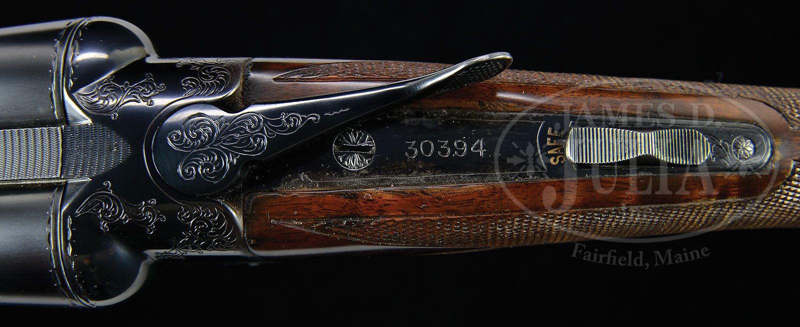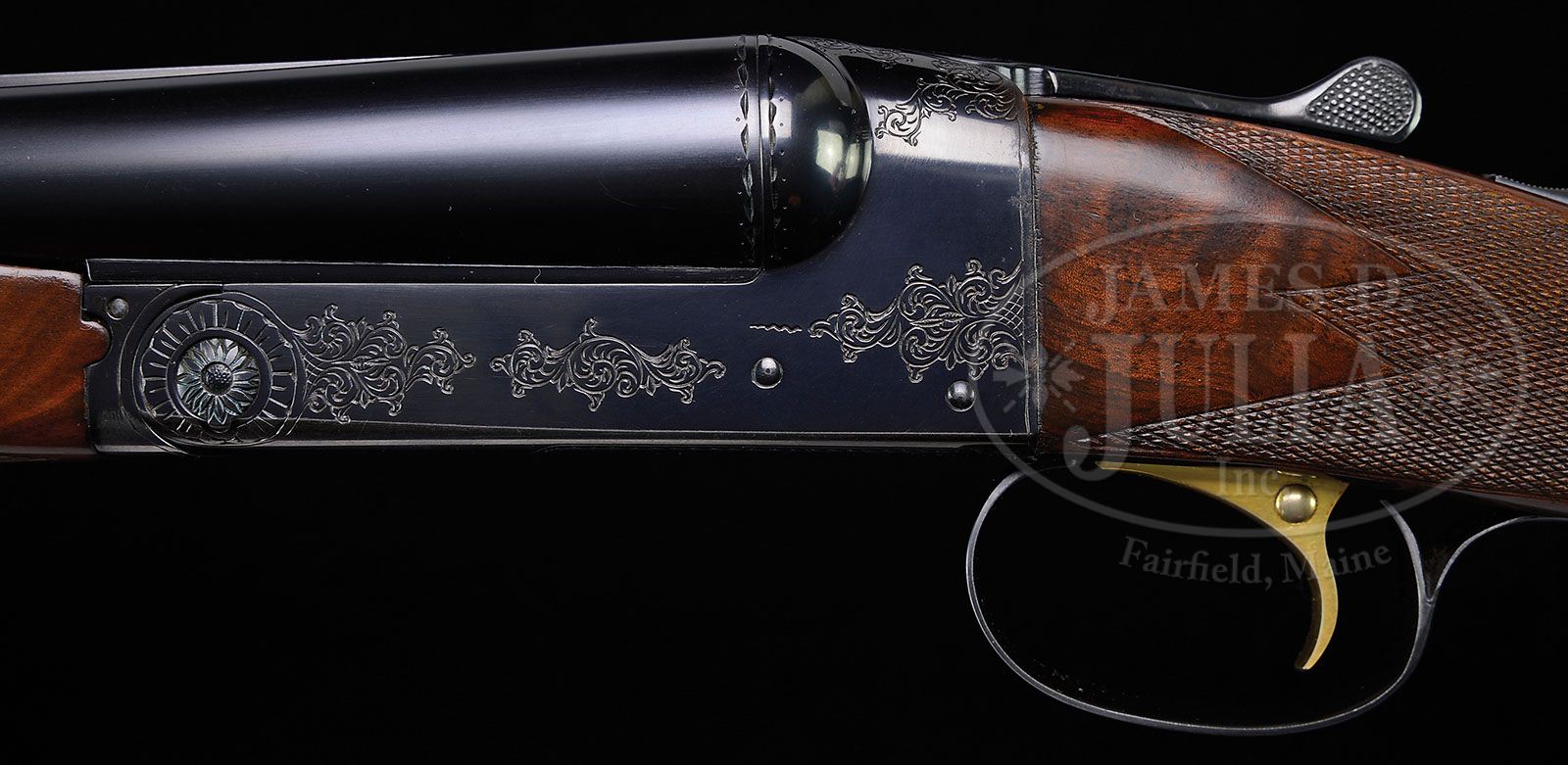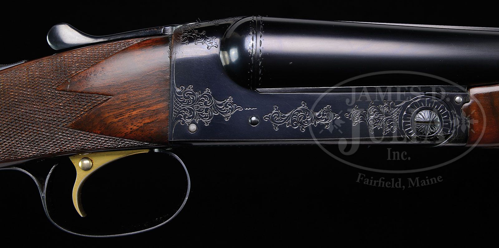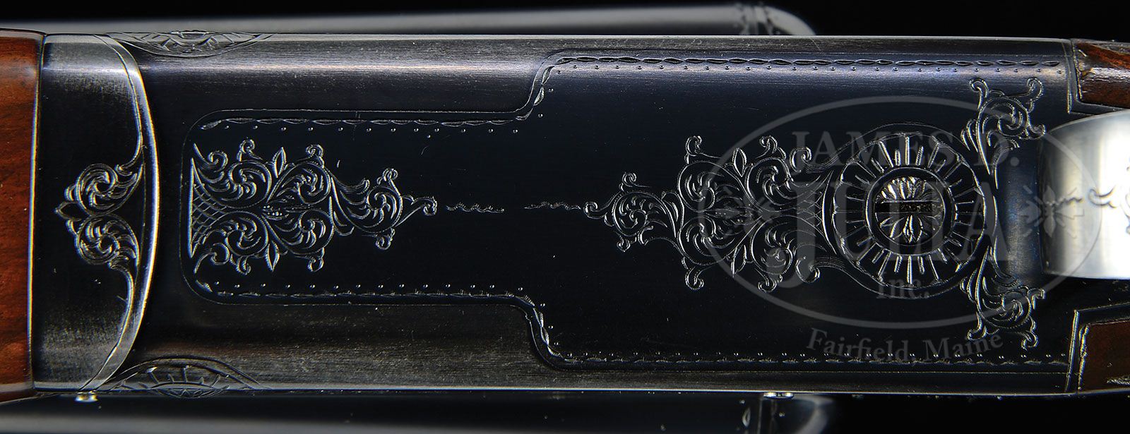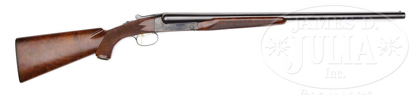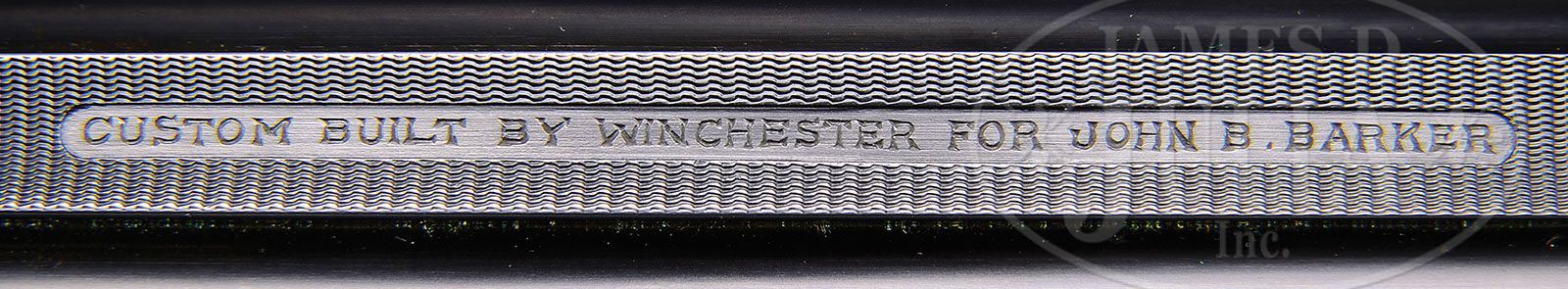 *WINCHESTER MODEL 21 CUSTOM WITH ORIGINAL BOX. SN 30394. Cal. 12 ga. 2-3/4″ Chambers. 26″ Bbls are engraved “CUSTOM BUILT BY WINCHESTER FOR JOHN B. BARKER” on milled out portion of concave rib, mounted with two ivory beads. Bottoms of bbls and bbl flats are stamped with all correct information; choked improved cylinder and modified. Blued, rounded action is engraved with custom grade type scroll. Steel capped pistol grip buttstock and beavertail forend are of nicely flame figured American walnut. Butt has typical Winchester plate. Bore diameter: left-.730, right -.730. Bore restrictions: left -.014, right -.003. Wall thickness: left -.031, right -.032. Drop at heel: 2-5/8″, drop at comb: 1-5/8″. Weight: 7 lbs. 5 oz. LOP: 14″. Gun closely matches all specifications in factory letter, the exception being gold oval engraved “JBB”, which is not installed on gun. Gun comes in its original cardboard box with label giving SN, and stating “Custom built for John B. Barker”. Box contains orig packing materials. PROVENANCE: Factory letter. CONDITION: Excellent, retaining nearly all of its orig finish. Bbls have 98% blue. Action retains approx 95% of its blue, silvered on side to bottom edges. There is some pitting from cleaned rust on top tang. Stocks have a number of minor marks and chips. Bores are excellent. Action is tight. Mechanically crisp. Box shows some lifting and discoloration from fiberglass tape, corners rubbed, and somewhat detached. Interior packing is good. 4-47723 MGM112 (10,000-15,000)