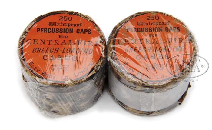 LOT OF TWO VERY RARE TINS OF ELEY BROS. CAPS FOR COLT THUER CARTRIDGES. Two 250-rd paper covered, lacquered tins of Eley’s “Waterproof / PERCUSSION CAPS / for / CENTRAL-FIRE / BREECH-LOADING / CASES”. Both tins have orange & black labels with mottled paper wrapping. Colt Thuer conversion revolvers are quite rare and their reloading equipment is even more rare. However, caps for reloading the cartridges are almost unknown, especially in orig sealed tins. These tins would certainly make a fine accessory to complete a cased set. CONDITION: Fine. Labels are intact with a few chips in the edges and light soil on one. Paper wrappings are brittle & fragile with the bottom covering and a few small pieces missing from one tin and a few small chips missing from the other but overall are mostly complete. Tins are plastic wrapped and were not checked for contents. 4-41979 JR248 (750-1,000)