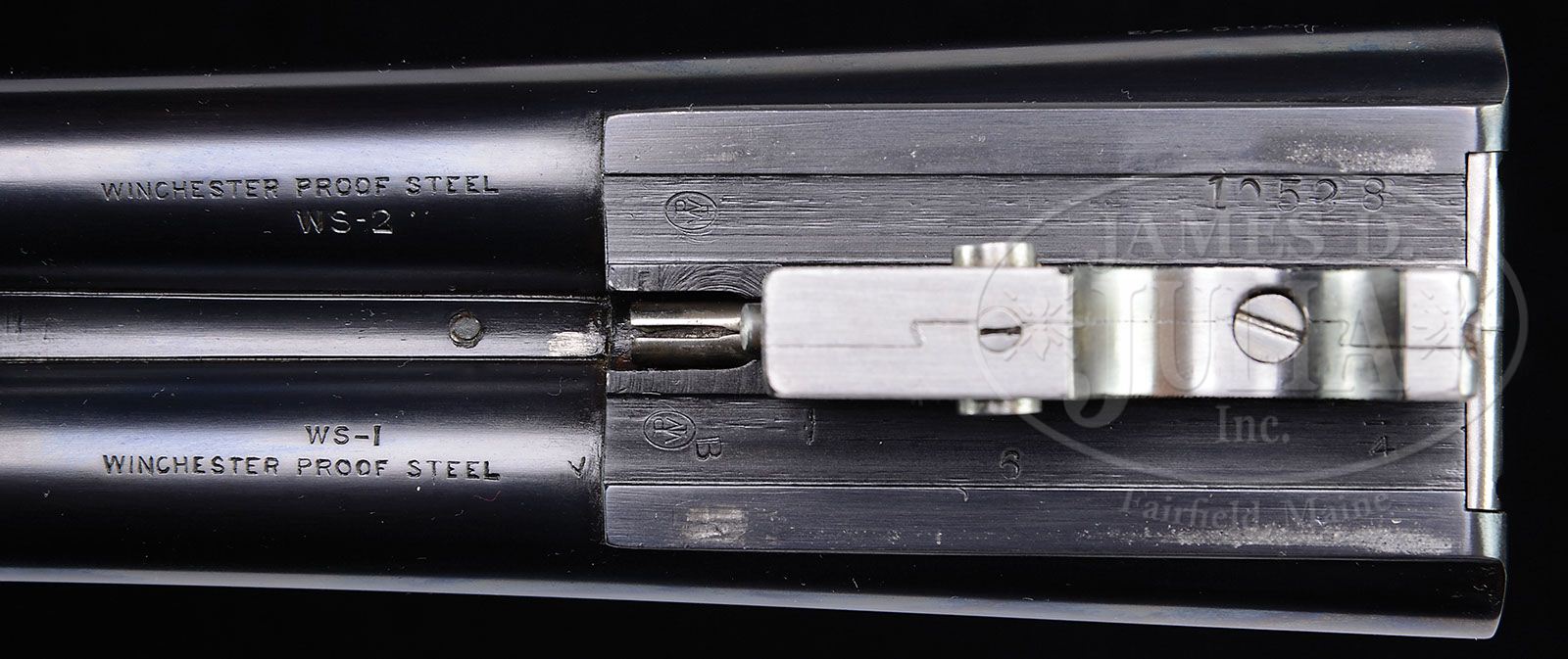 *WINCHESTER MODEL 21 SKEET GUN WITH EXTRA BARRELS AND CASE. SN 10528. Cal. 12 ga. 2-3/4″ Chambers. 26″ Bbls. Factory records indicate that this fine skeet gun, finished in 1948, was returned to the factory in 1951 for an extra set of 26″ bbls choked “Improved Mod” and “Full”. This gun fits original specifications except for forend (which is not specified), and butt (specified checkered). Gun has all correct markings and stamps, including “Skeet” on trigger plate, and features non-selective safety, single trigger, and a Winchester red pad has been added to nicely figured American walnut buttstock with standard checkering and composition grip cap. Braced beavertail forend has matching checkering. Skeet bbls: Bore diameter: left-.727, right -.728. Bore restrictions: left -.009, right -.004. Wall thickness: left -.030, right -.032. Drop at heel: 1-15/16″, drop at comb: 1-1/2″. Weight: 7 lbs. 5 oz. LOP: 14″. Extra set of Bbls: Bore diameter: left-.731, right -.730. Bore restrictions: left -.035 (Full), right -.013 (Lt Mod). Wall thickness: left -.018, right -.030. Drop at heel: 1-15/16″, drop at comb: 1-1/2″. Weight: 7 lbs. 3 oz. LOP: 14″. Newly made, high quality, leather case with stitched leather corners, and leather trimmed canvas outer cover, is lined in burgundy cloth with black leather gold embossed Winchester label on lid, has space for gun and both sets of bbls, and contains 2-pc cocobolo and brass cleaning rod with leather wallet holding mops and brushes, square oil bottle, Winchester marked snap caps, broken case extractor, and an empty cardboard Western Expert Super Target Load box. CONDITION: Excellent, retaining essentially all of its factory quality finishes, engraving slightly softened, and a few marks in wood under finish. Checkering nicely re-cut. Bores are excellent. Chambers of heavy choked bbls are pitted. Action is tight. Ejectors and trigger are excellent. Case leather is excellent, with only a few of the lightest compressions. Protective cover has some light scuffing on corners. Interior cloth is excellent, as are accessories. 4-48189 MGM179 (6,000-9,000)