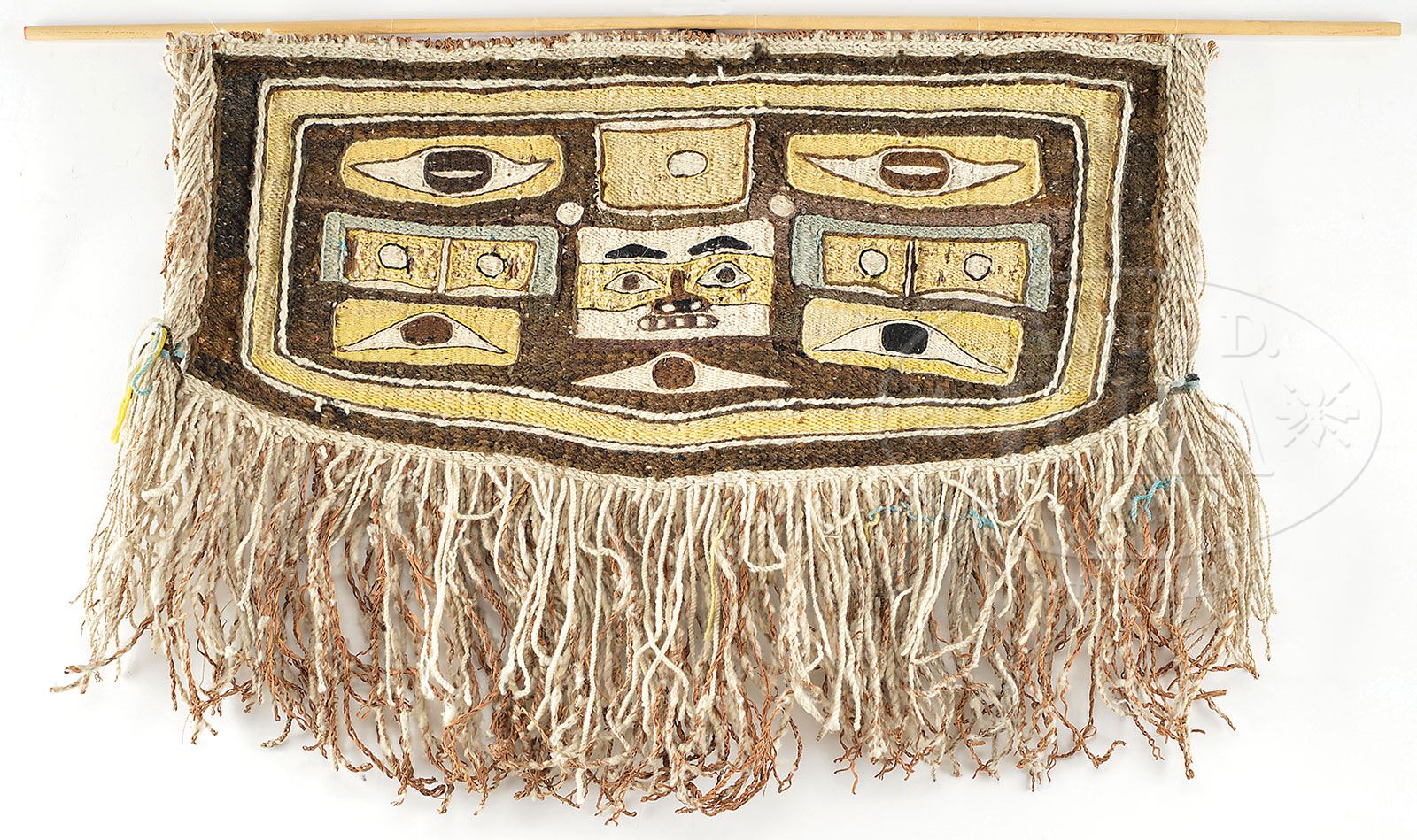LATE 19TH CENTURY CHILKAT CHILD’S BLANKET. The piece made with cedar bark and mountain goat wool, circa late 19th century. The central weave with nine emblems including a central totem design of a brown bear, and five kayak-type emblems. Colors in yellow, blue, brown and white. The piece bordered on three sides with long fringe. SIZE: Without fringe: 12″ x 25″. With fringe: 21″ x 27″ CONDITION: In fragile condition, with losses, some repair, generally in tact, but sold as found. 9-90317 (2,000-4,000)