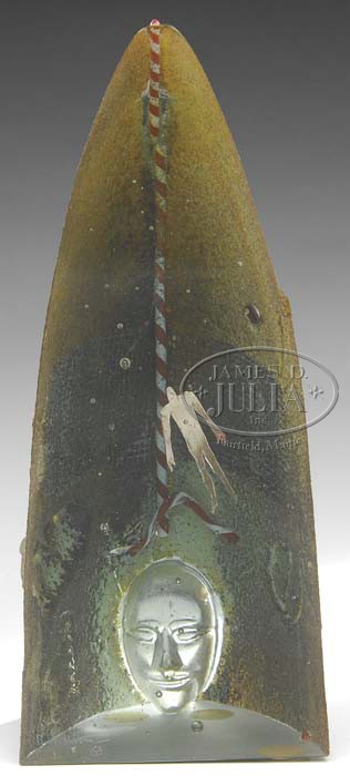 BERTEL VALLIEN PAPERWEIGHT SCULPTURE. Very interesting paperweight sculpture has deeply impressed face of a man at the bottom back edge of the piece. A copper metal cutout of a man floats in the center of the sculpture against a background of inlaid metal screen. Interior is further decorated with a red and white striped line extending from the peak of the sculpture to just above the impressed man’s head. Exterior sides are finished in a heavy stone-like crust and are decorated with metal inlays as well as a raised face mask lying diagonally. Signed on the bottom left hand corner “B Vallien P.9.86”. SIZE: 10-1/4″ t. PROVENANCE: From the Collection of Dr. & Mrs. Ivan Cohen. CONDITION: Very good to excellent. 5-62847 (600-900)