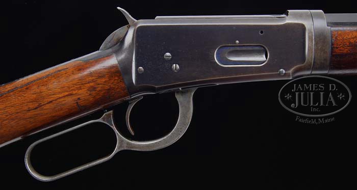 *SPECIAL ORDER WINCHESTER MODEL 94 TAKE DOWN LEVER ACTION RIFLE. SN 401154. Cal 32 WIN SP. 26″ 1/2 rnd/oct bbl, full mag take down, replacement dovetail fine bead front sight, Winchester 32 smokeless rear sight. Standard 94 receiver, mounted with nicely figured walnut, uncheckered forend with nose cap, uncheckered straight grip stock with steel crescent buttplate. CONDITION: Fine. Bbl retains 85-90% orig blue, muzzle wear blending with gray patina, sharp edge wear on oct portion and some minor nicks and dings. Mag tube has 75-80% orig blue blending with brown patina. Receiver retains 75-80% orig blue, silvering on sharp edges and balance blending with brown patina. Loading gate shows strong nitre blue, thinning in flute. Hammer has strong orig case colors with some minor silvering on sides. Lever shows traces of strong orig case colors in protected areas blending with a silver patina. Stock is sound with about a 4″ scratch on right side grip area, usual nicks and dings and handling marks, some darkening around buttplate from flaking finish and retains 70-80% orig finish blending with hand worn patina. Forend is sound with a depression dent, center right side, usual nicks and dings with hand worn patina blending with orig finish. Mechanics are crisp with a shiny bore. 4-37969 BDT102 (2,750-3,750)