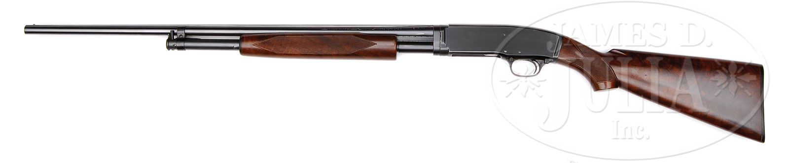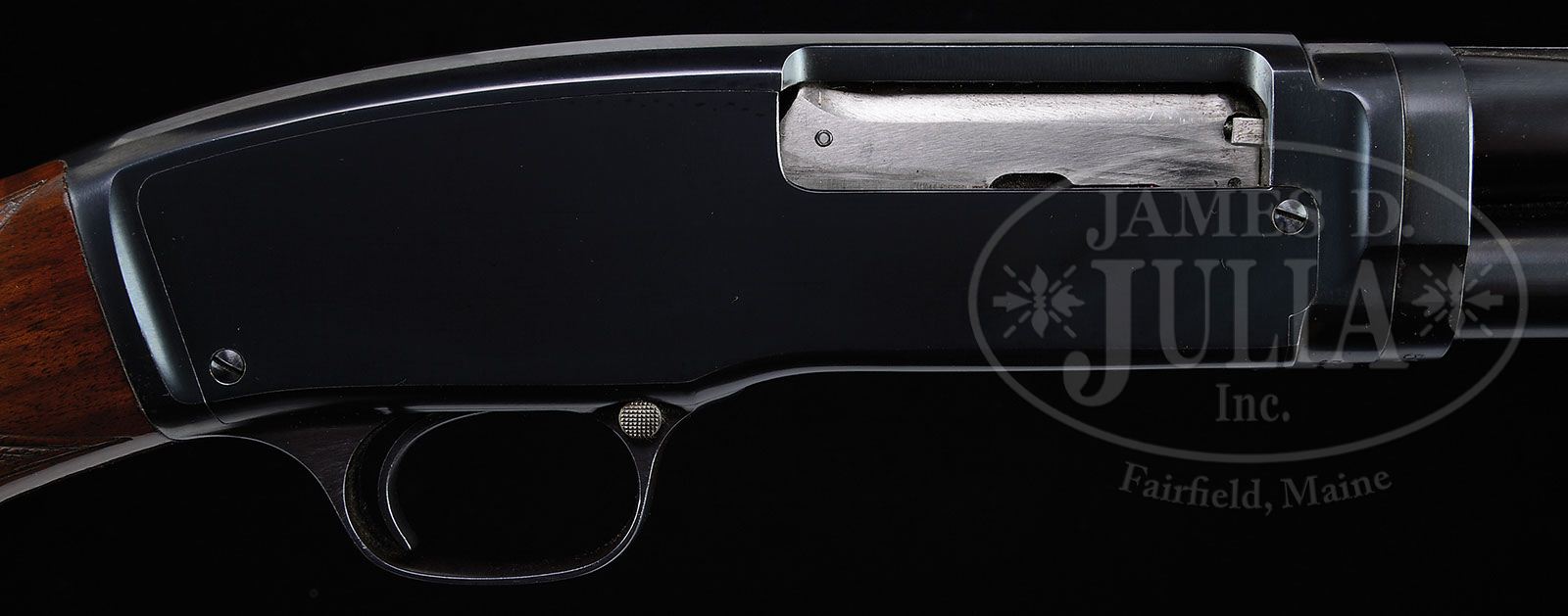 *.410 WINCHESTER MODEL 42 SKEET GUN WITH 2-1/2″ CHAMBER MARKING. SN 52076. (ca 1945) Cal. .410. 2-3/4″ Chamber. 26″ Barrel has solid matted rib. Bbl has all markings on left side, and is marked for “skeet” choke. Following the 2-1/2″ chamber designation. A “3” has been stamped in, indicating conversion to 3″. Chamber plug indicates chamber length is 2-3/4″. Bbl date “41” is stamped at breech end. Standard blued action. Nicely flame figured XXX American walnut pistol grip stock measures 14″ over hard rubber Winchester buttplate, and has standard checkering, and no grip cap. Extended forend is of matching wood with two panel checkering. Drop at heel: 2-9/16″. Drop at comb: 1-9/16″. Weight: 6 lbs. 4 oz. LOP: 14″. CONDITION: Excellent, retaining nearly all its orig finish on wood and metal, with some minor marks and a few flecks on bbl, and light scruffs from contact with forend. Action is slightly browned from hardened rubbed on oil, with some light marks on left side toward top rear. Wood has some slight marks and light scratches. Bore is excellent. Action is crisp. An unusual gun made right at the transition to post-war production. 4-46816 MGM25 (2,500-3,500)