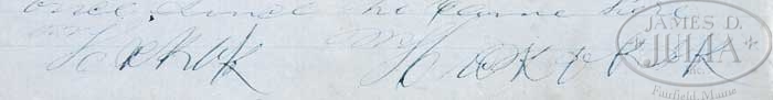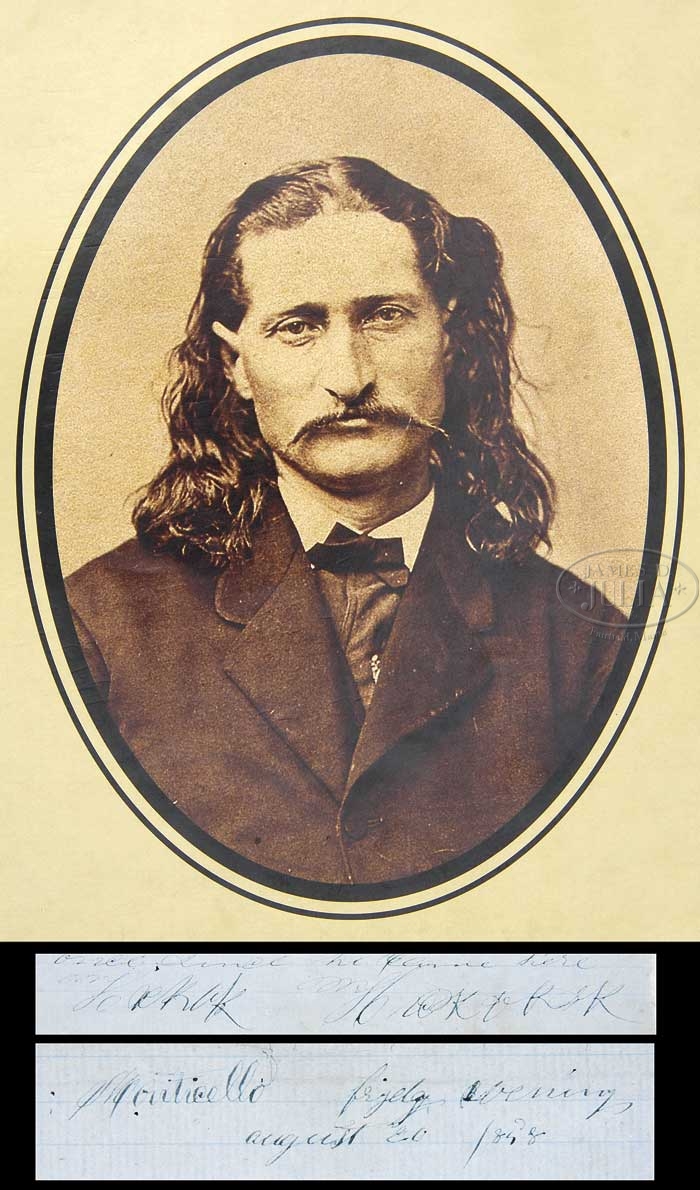 EXTRAORDINARILY RARE JAMES BUTLER HICKOK “WILD BILL HICKOK” LETTER SIGNED FOUR TIMES. James Butler Hickok was born in 1837 and met his early demise at the hands of an assassin in 1876. He was an extraordinarily historic and renowned Western Figure. Originally an American scout, later a Frontier law officer, and US Marshall in 2 notoriously violent frontier cattle towns. Monticello fryday evening, august 20 1858 I have raked And put up A tun (ton) of hay in an hour and a half and now I will write a little more to you if I can think of anything more to write you must not blame me if you cant read my writings for evry spare moment I have I sit down on my bed and put my paper on a Book and Write a few lines and then quit and that is the reason I don’t write Better. I guess sitting Bent over Writing on ones nee (knee) aint a verry (very) nice way of resting ones self I dont think. I have to go mo (mow) one hundred tun (ton) of hay yet and mabee (maybe) too (two) hundred I dont no (know) yet exacly (exactly) how much I have got to mo (mow). thare (There) is considerable sickness in the teritory (territory) jest (just) now though there are but few deaths. Scarcely any one dies with the fevers that they have here. Write me all the news. When you Write again if you pleas (please) Let us all no (know) how the Corryel (corral) gets along for gerry want to no (know) verry (very) Bad. I guess he had told me to say that he had Writen (written) to you once Since he Came here. JM Hickok JM Hickok Monday Morning, 23 I would have finished this letter yesterday But I was not at home. I was over at John Owens. I go thare (there) when I get hungry jist (just) the same as I youst (used) to come home to mothers to get some thing good to eat. Mary Cut off A Lock of my hare (hair) yesterday and sayd (said) for me to send it to my mother or sisters if she had not thought a good deal of you all she woud (would) not have Cut it of (off) for she thinks A grate (great) deal of it At least she is allwais (always) Coming (combing) and Curling it that is when I am thare (there) James B. Hickok I may not write again for A few days so I will write a little more. I received A letter from celinda friday. Mary got it and read it for she reads evry (every) letter that I get and sayd (said) she would answer it for me and tell celind (a) all About that girl she spoke and tell hur (her) her name it is noon now and I am waiting for my diner (dinner). I promised gery that I would Come out to olatha and see him last Sunday but it rained all day and I did not go. James B. Hickok CONDITION: Presented in a special hardbound case with a Tipton image of Wild Bill Hickok. Generally very sound, Text: slightly faded and with scattered light stains. An exceedingly rare document. 4-40874 JJ2 (100,000-150,000)