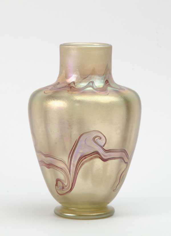 DECORATED TIFFANY VASE. Iridescent finish with decoration of rust and gold, hooked feathers and a garland of rust and gold decoration around the shoulder. Signed “LCT B1393”. SIZE: 6 3/4″ tall. CONDITION: Very good to excellent. 5-68371 (4,000-6,000)