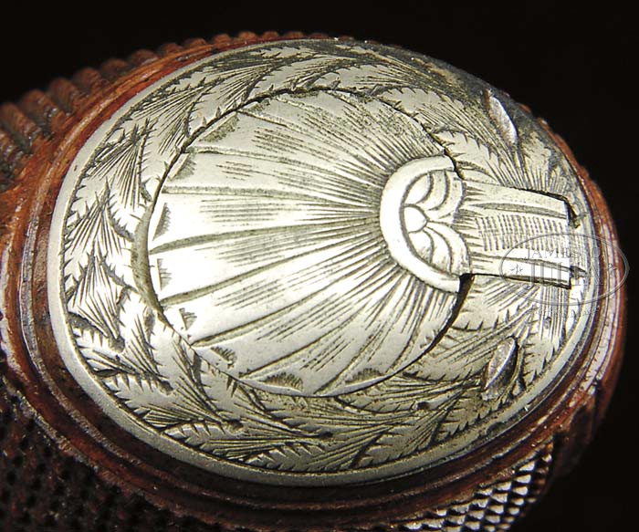 EXTRAORDINARY CASED PAIR OF TRYON GOLD INLAID PHILADELPHIA PERCUSSION DERRINGERS. Cal. About 36. Spectacular pair of derringers with 3-5/16″ ovoid shaped bbls with flat tops and iron rails on bottoms with single guides containing ebony ramrods with German silver tips and concealed worms. Top flats of bbls have tiny dovetailed sights with German silver blades and 15/16″ x 1/4″ elliptical shaped gold inlays marked “PHILADELPHIA”. Breech plugs are color case hardened with two wide gold bands and two narrow platinum bands and have shielded nipples with gold blow-out plugs. They are mounted in 1-pc walnut stocks with raised side panels that have checkered grips and German silver furniture with scallop shell engraved cap boxes in the butts. Bases of cap boxes are engraved with acanthus leaf patterns. Locks are short American style, 2-3/4″ long with rounded back edges and flat-sided hammers. Lockplates & hammers are wonderfully engraved in American-style foliate arabesque patterns with fine stippled & shaded backgrounds. Lockplates have a 5/8″ x 3/16″ elliptical shaped gold inlay engraved “TRYON”. The breech plugs have long tangs that are engraved to match, secured by two screws. Stocks have German silver tips on forestocks that are wonderfully engraved with a sunburst pattern around the ramrod opening and foliate patterns on the tangs. Trigger guards are beautifully engraved in foliate arabesque patterns with long pointed finials engraved in shell & foliate patterns with rosettes around front screws. Each pistol has an empty elliptical shaped thumbplate. Accompanied by their orig German silver mounted reinforced mahogany casing with an elaborate, empty plate in the lid. Interior is burgundy velvet lined & French fitted for the pistols, an ivory handled ebony cleaning rod with German silver tip, a German silver tipped ebony bullet starter/ramrod with barrel shaped mallet head, an orig nutcracker style single ball mold with blued steel sprue cutter, a tiny red leather covered brass flask, an ivory implement handle with German silver ferrule and all of the bits & pieces for the cleaning rod and implement handle plus a German silver powder measure. Case has two tiny covered compartments, one containing a non-functioning key and the other several cast lead balls. These pistols are cased nearly identically to a cased pair of Dragoon pistols that belonged to James Janeway-Van Sickle and obviously made by the same casemaker. The quality & workmanship of these pistols is extraordinary and certainly are comparable to the Van Sickle Dragoons. It is known that in Mr. Van Sickle’s will he bequeathed a pair of Dragoons or cased Colts and two other sets of cased pistols. Given the similarity of the casings there is a strong possibility that these pistols were also part of the Van Sickle estate. High quality American made gold inlaid cased sets of pistols are a great rarity and seldom encountered, especially those from Philadelphia makers such as Tryon. The Tryon Company was established in Philadelphia in about 1811 and remained a family business, manufacturing firearms well into the 20th century. CONDITION: Very fine. One pistol is extremely fine, retaining most of its orig brown bbl finish and case colors on breech block; stock is sound with sharp edges and retains most of its orig varnish; German silver furniture is fine with sharp engraving. Mechanics are fine, strong bore with moderate pitting toward chamber end. Second pistol is very fine with the bbl brown lightly faded with sharp edge wear and some thinning; breech block case colors have turned dark; lockplate, hammer & top tang retain most of their orig bright metal finish; stock is sound with a few light chips in the finish and retains most of its orig varnish with light diamond point wear on checkering. Hammer will not hold at full cock; strong bores with moderate pitting toward chamber ends. Both pistols show rust around the nipples probably from having had caps fired without cleaning afterward. Case is sound with scattered stains on lid and normal handling & storage nicks & scratches and retains most of its orig varnish; interior of the lid is moderately faded and stained from contact with the pistols and a few other spots; bottom is heavily faded to a pink shade with light soil; implements are all fine with the mold sprue cutter retaining about 75% bright blue; flask is very fine. 4-45570 (65,000-125,000)