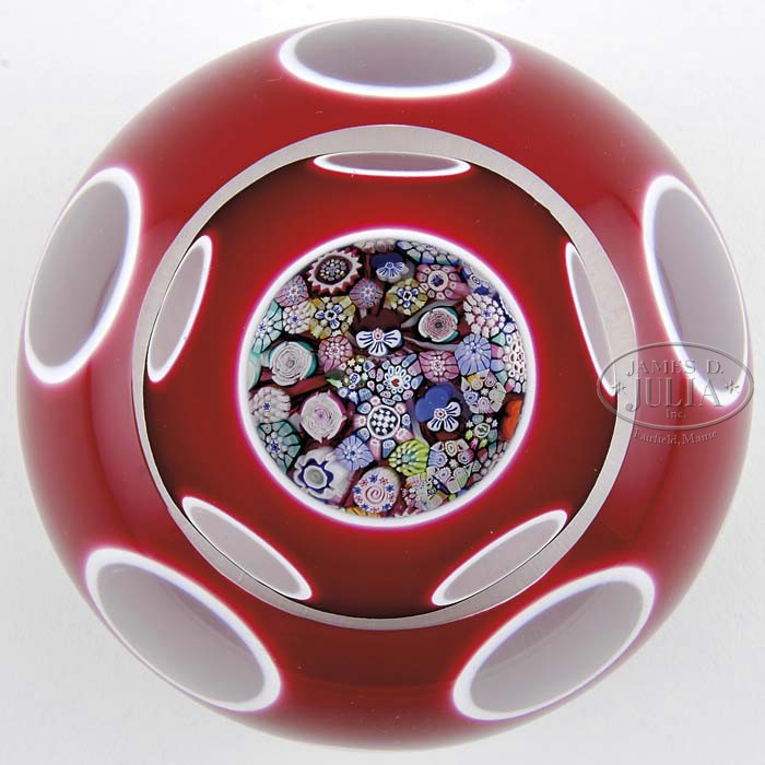 JOHN DEACONS ENCASED DOUBLE OVERLAY PAPERWEIGHT. Close packed millefiori paperweight with complex canes is encased in crystal with a red over white double overlay also encased in clear crystal. One large top facet and signed on underside with “JHD 2004″ signature/date cane. SIZE: 3-3/4″ dia x 2-5/8” t. PROVENANCE: Barry Schultheiss Collection. CONDITION: Very good to excellent. 5-63514 (300-600)
