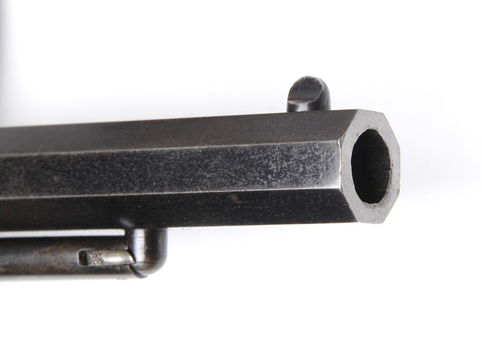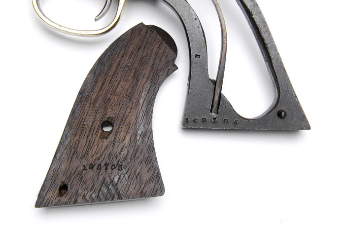 MARTIALLY MARKED REMINGTON NEW MODEL ARMY PERCUSSION REVOLVER. SN 109705. Cal. 44. Blue finish with 8″ oct bbl, pinched post front sight and 3-line bbl address. It has brass trigger guard and is mounted with 2-pc walnut grips numbered to this revolver. Left grip has a crisp legible cartouche and various pieces & parts of revolver have small inspector initials. The Remington Army was an extremely popular revolver during Civil War due to its ease of cyl change and solid frame which gave it good durability & accuracy. CONDITION: Very fine, all matching including cyl & grips. Bbl retains about 80% orig blue with the losses flaked, not worn, to a medium patina. Frame & rammer handle retain virtually all of their glossy orig factory blue with some slight thinning on front & back straps. Cyl retains about 80% thinning orig blue. Grips are sound showing light wear with crisp cartouche and retain most of their orig oil finish. Hammer retains most of its orig case colors. Mechanics are crisp, brilliant shiny bore. 4-41182 JR26 (3,000-5,000)