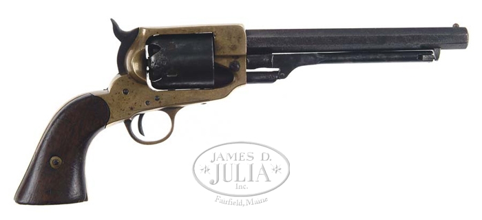 CONFEDERATE SPILLER & BURR REVOLVER. SN 1031. This gun appears 100% orig in all regards. Matching SN’s occur on bbl, loading arm, arbor, frame, and stocks. Trigger guard should be numbered internally but trigger guard has not been off gun in a long time. Cryptic on frame under grips is “LL”. Included is a letter from Confederate arms dealer John Sexton which states that this pistol is authentic in all regards and that it was originally sold in 1970 by Richard Bourne out of the Rothschild Collection. CONDITION: Bbl and latch are gray with scattered areas of pitting. Loading assembly, cylinder, and hammer mostly smooth with areas of pitting. Frame has good yellow brass patina worn through where gun is handled. 4-56115 (20,000-25,000)