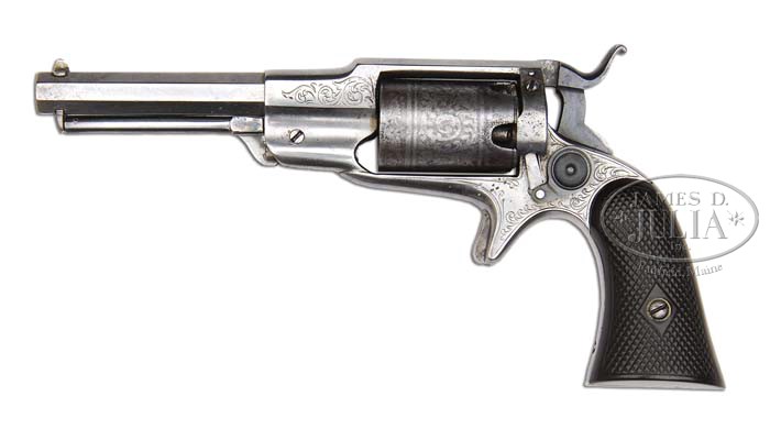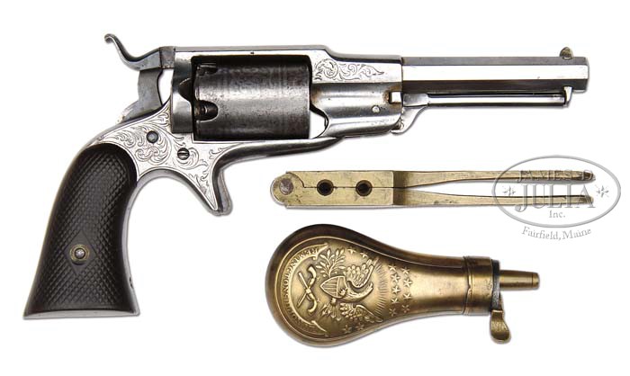 RARE ENGRAVED REMINGTON 3RD MODEL BEALS PERCUSSION SPUR TRIGGER REVOLVER. SN 148. Cal. 31. Fine rare revolver with 4″ oct bbl, tiny dovetail front sight and 2-line Beals Patent & Remington address. Top strap is grooved for the rear sight and it has an attached 2-pc rammer. Cyl is unfluted, 5-shots and left side of frame has the exposed pawl. Mounted with coarse checkered 2-pc hard rubber grips numbered to this revolver. Inside left grip is hand scratched “Dr F W JOHNSON / GRESHAM / WISCONSIN” and right side “F.V.J. / Aug / 1968”. The frame & front side flats of frame are lightly engraved with foliate arabesque patterns and the cyl is etch engraved in foliate arabesque patterns. Accompanied by a hinged lid walnut box 9-1/2″ long x 5-3/4″ wide x 1-7/8″ deep, burgundy velvet lined in the lid with an open bottom containing a dbl sided eagle & stars “REMINGTONS. ILION. N.Y.” all brass flask and a Remington brass 2-cavity bullet & ball mold without sprue cutter. According to Flayderman’s Guide to Antique American Firearms only about 1,000 of these rare revolvers were produced in the period 1859 to 1860. PROVENANCE: Fred B. McDonald Estate Collection. CONDITION: About fine. No orig finish remains being an overall bright cleaned metal. Cyl retains most of its orig etch engraving that is worn & cleaned a little thin. Grips are sound, turned chocolate showing moderate to heavy wear. Box is fine. Mold & flask are sound and retain an overall medium mustard patina. Mechanics are fine, strong bore with scattered fine pitting. 4-41399 JR119 (3,000-5,000)