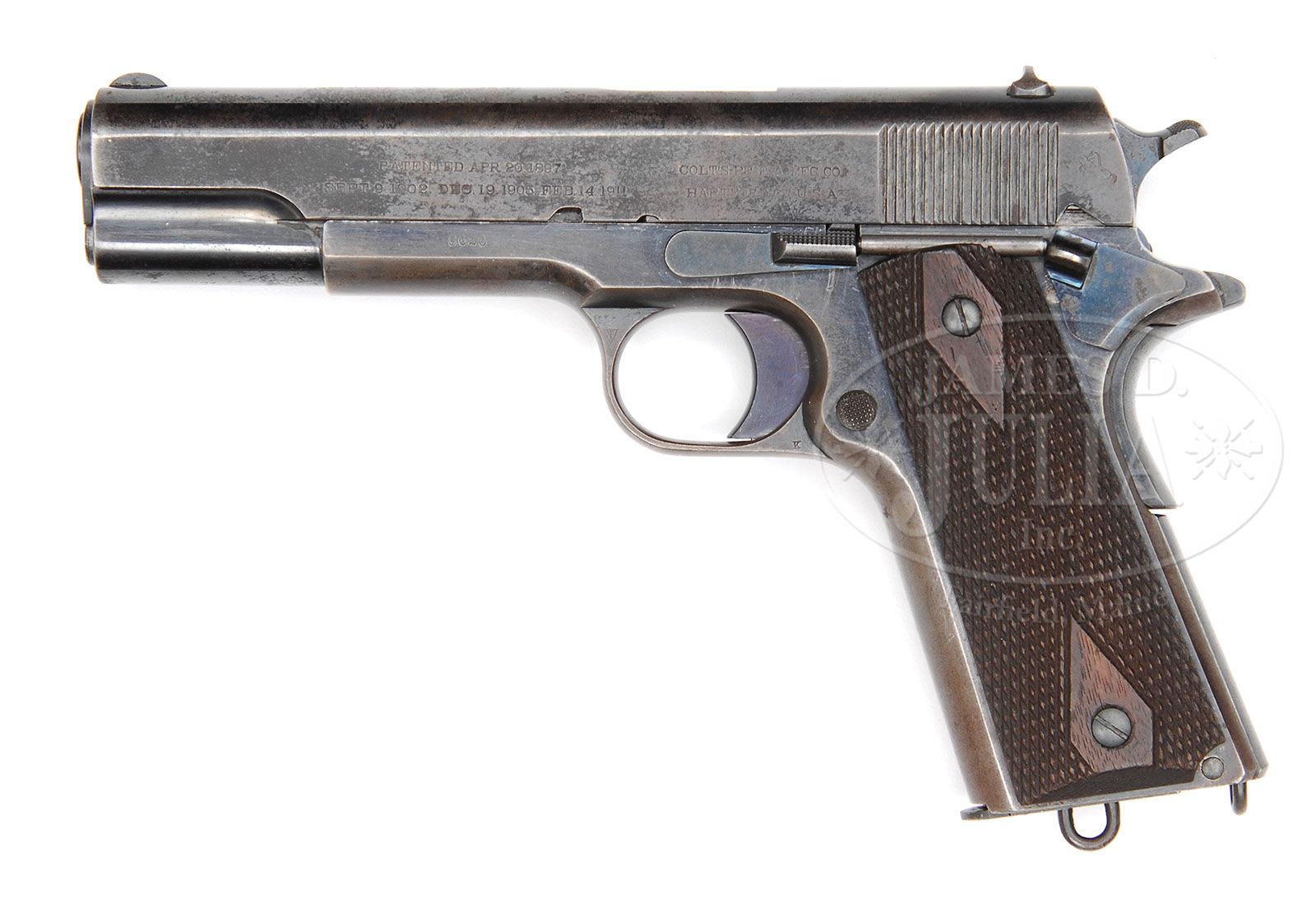 *RARE FIRST YEAR PRODUCTION COLT GOVERNMENT MODEL SEMI-AUTO PISTOL. SN C620. Cal 45 ACP. Blue finish with 5″ civilian bbl marked with a small “s” in front of the bbl lug and a “c” on the end of the skirt. Slide has orig thin front sight and round top rear sight with standard markings on the slide, the last patent date being 1911. Left front side of the frame is marked with a SN and right front side of the frame is marked “GOVERNMENT MODEL”. Frame has early features with fire blued trigger, thumb safety, hammer and slide lock with bright polished grip safety and spring housing. Mounted with diamond checkered walnut grips. Accompanied by one orig 2-tone lanyard loop magazine. All appended parts appear to be orig except the bbl bushing which may be an old period of use replacement. The flat under the firing pin retainer is stamped with a small “s”. There is also a small “s” on top of the frame just in front of the hammer slot. CONDITION: Fine to very fine. Appears to be all orig. Slide retains about 60% glossy orig blue with only slight muzzle end wear and the balance of the losses flaked, not worn, to a medium patina. Frame retains about 40% thinning orig blue, having been handled more than shot, with the loss areas a blue gray patina. Fire blued parts retain strong orig, bright colors. Grips are sound, showing moderate wear on the right side and light wear on the left side. Magazine is dark on the top half with strong blue on the bottom half. Mechanics are fine. Bright shiny bore. 4-47716 JR378 (5,000-8,000)