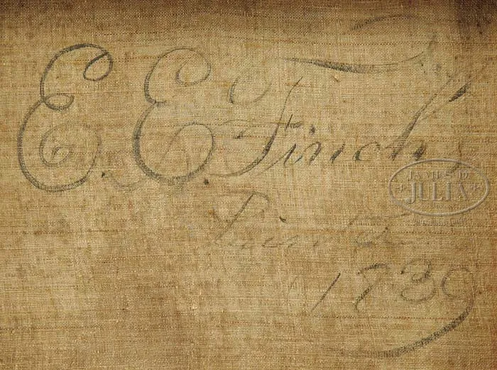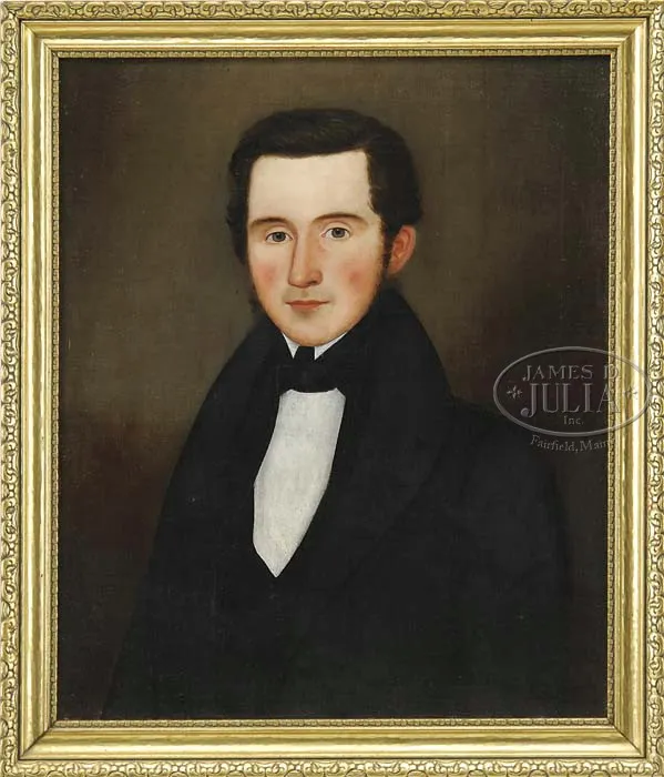 E. E. FINCH (American, Active 1832-1850) PORTRAIT OF A GENTLEMAN. Oil on canvas Maine portrait of a young gentleman wearing black coat and white shirt. The back signed in artist hand script “E E Finch Painted 1839″. Housed in a modern gold frame. SIZE: 24″ x 20”. PROVENANCE: From a fine Kennebunkport, Maine home. CONDITION: Restored, very good. 9-22491 (400-800)