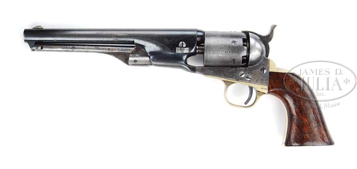 COLT MODEL 1861 NAVY PERCUSSION REVOLVER. SN 26079. Cal. 36. Blue and color case hardened with 7-1/2″ rnd bbl, German silver front sight and 1-line “NEW-YORK AMERICA” address. Left side of frame is marked “COLTS PATENT” and the left shoulder of the trigger guard has the cal marking. It has silver-plated brass trigger guard and backstrap containing a 1-pc walnut grip with the last four numbers of the SN in the backstrap channel. Several hundred of these revolvers were sold to the government and are martially marked. Many others were private purchases and, with their streamlined look, were quite popular among troops in the Civil War. Many continued in service long after the Civil War on the western frontier with civilians expanding westward. CONDITION: Very fine, all matching incl wedge and grip. Bbl retains 75-80% orig blue, strong and bright in sheltered areas, thinning over the top and sides of the bbl. Rammer and handle retain most of their orig case colors, faded on the handle, bright on the pivot. Frame retains about 80% bright case colors on the sides with the recoil shields having faded colors in sheltered areas, mostly turned silver. Hammer retains 60-70% strong case colors. Cyl is mostly a blue-gray patina with about 80% Ormsby naval battle scene. Grip frame retains traces of silver-plating in sheltered areas being mostly a light mustard patina. Grip is sound with some hammer marks on the bottom edges that correspond to marks on the buttstrap with usual handling and use marks and retains most of a re-finish over about 25-30% orig finish. Mechanics are fine, strong bore with moderate to heavy pitting. 4-38588 (7,000-9,000)