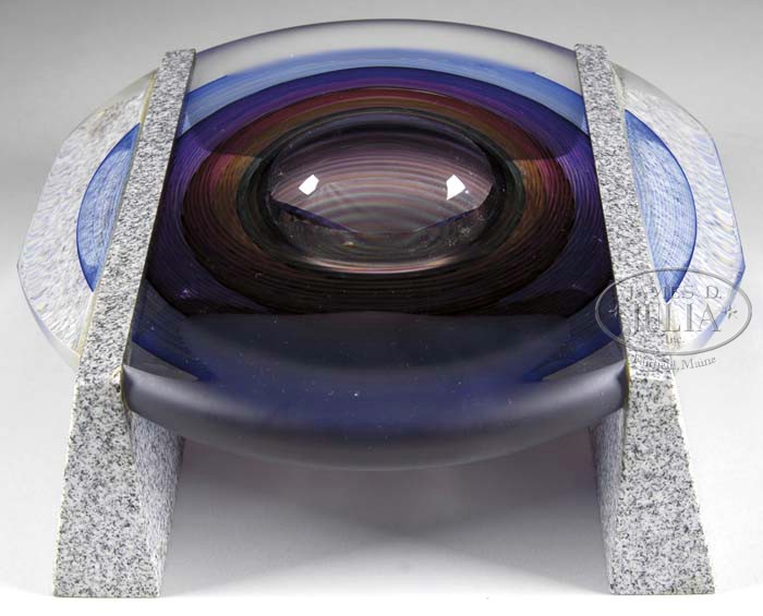 KARBLER & DAVID BULLS EYE BOWL. Very interesting glass and granite bowl features small center bowl opening surrounded by concentric circles of green, gold, maroon, purple and blue giving the bowl a bulls eye sculpture appearance. Glass is mounted against two polished granite legs. Center section of the bowl is polished, while the outer two sides are frosted. Signed on the underside “Kit Karbler 28753 Michael David”. SIZE: 9-1/2″ w x 4″ t. PROVENANCE: From the Collection of Dr. & Mrs. Ivan Cohen. CONDITION: Three small nicks to inside lip of bowl, otherwise very good. 5-62897 (500-700)