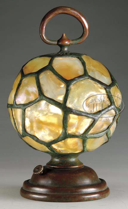 TIFFANY STUDIOS TURTLEBACK DIVER’S HELMET LAMP. Extremely rare desk lamp begins with a circular bronze pedestal foot that supports turtleback tiles in the shape of a diver’s helmet. The turtleback tiles are a beautiful butterscotch hue with an ethereal clambroth coloration with both colors having a handsome iridescent finish. Lamp is completed with a bronze hammered loop handle with open work beneath. A single socket is used for the proper illumination of this lamp. Signed on the underside “Tiffany Studios New York 5094” and also has the Tiffany Glass and Decorating logo. A similar example of this lamp is pictured in Tiffany At Auction by Alastar Duncan on page 96, plate 262. SIZE: Overall 10-1/2″ t. CONDITION: Very good to excellent with several tight hairlines. 5-61538 (15,000-20,000)