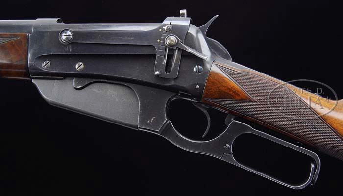 *OUTSTANDING WINCHESTER 1895 DELUXE LEVER ACTION RIFLE. SN 27201. Cal. 30 US (30-40 Krag). 26″ rnd bbl, pedestal front base with pinned fine bead front sight, rear seat filled with slot blank. Standard Model 95 receiver, left side with Lyman lever peep sight, mounted with highly figured walnut, deluxe H-checkered Schnable forend with ebony tip insert, checkered straight grip stock with steel crescent buttplate. CONDITION: Extremely fine. Bbl retains 97-98% orig blue with some minor little scuff marks and thinning, blending with brown patina behind front sight base. Receiver retains 97-98% orig blue with small spot in center of top right side and some minor light scuff marks scattered around. Stock is sound with sharp checkering, only a few minor handling marks and retains virtually all of a fine professional hand-rubbed oil finish. Forend is sound with a couple of minor handling marks, sharp checkering and retains virtually all of a fine professional hand-rubbed oil finish. Mechanics are crisp, bore with strong rifling and a few minor scattered pits. 4-37461 BDT96 (6,500-9,500)