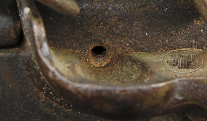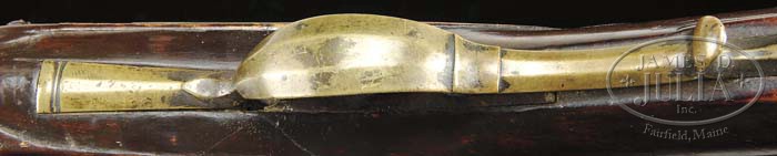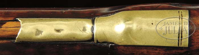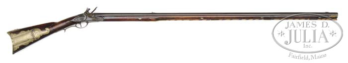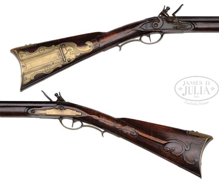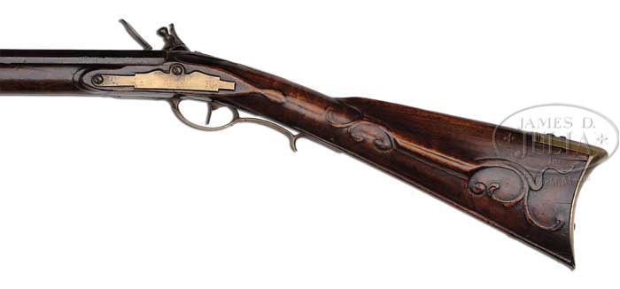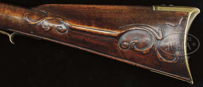 Additional Information: Using a bore scope, it has been determined that approximately 14” of barrel has been added to this rifle. This work was possibly done at the time of reconversion. The work is very well done and from outward appearance of the gun , cannot be detected. As such, it is a great example of Schreyer’s early work and the estimate reflects the value of this fine KY rifle. THE AWARD WINNING RELIEF CARVED GEORGE SCHREYER “RATTLESNAKE” GOLDEN AGE RIFLE. This spectacular rifle has a 47 ” full oct unsigned .49 cal smooth bore bbl. The rifle is 62-1/2″ overall and the butt of the rifle is a full 1-3/4″ thick at the butt plate. This grand Kentucky rifle was featured as rifle No. 8 in Dr. George Shumway’s book “George Schreyer Sr. & Jr. – Gunmakers of Hanover, York County, Pennsylvania”. In the book Shumway writes: “This piece is notable for the patch box finial engraved with a rattlesnake design, and although the bbl is unsigned, there can be no doubt that it was made by George Schreyer Sr. Most Schreyer guns are equipped with German locks, but this one has a lock of English style with rounded pan”. “The left side of the stock is nicely carved with relief designs and incised volutes. The top of the wrist does not have Schreyer’s usual fleur-de-lis design, but instead has a lobate design in relief”. As evident by its accompanying framed receipt, this rifle is from the famed Kindig collection. This orig document made out to Earl F. Lanning, Waynesville, N.C. and dated 1963 reads: “One fine early George Schroyer flint lock rifle with his fine typical relief carving and the earliest rattlesnake patch box that I have ever seen. I would have loved to have had this in the book but only bought it about 6 months ago from Wes White…Joe Kindig Jr”. As noted in the receipt, the Rattlesnake Schreyer was purchased from Kindig by noted Kentucky rifle authority and collector, Earl Lanning for the tidy sum of $1100. A recent letter reminiscing his long ago experience of purchasing and owning this Kentucky accompanies the rifle. In the early 1970’s Mr. Lanning sold the rifle and it became the prized possession of Mr. Everett “Bernie” Partridge who kept it until his death in 2008. A true work of art, in 1979 the rifle was recognized and awarded “Best Relief Carved Rifle” by the Kentucky Rifle Association. The silver award medal accompanies the rifle. PROVENANCE: Wes White; Joe Kindig, Jr.; Earl Lanning; Everett “Bernie” Partridge. CONDITION: Very fine. The last 12″ of the fore stock has been properly restored with the forward thimble and nosecap appearing to be original to the rifle. There is a 3-1/2″ wood repair above the front of the lock and it appears there has been a minor wood repair below the lock and a diagonal crack repair 3″ from front of side plate screw to bbl. All repairs are sound. The flintlock is a reconversion to flint. None of this detracts from the importance and beauty of this classic example. 4-45117 RGG7 (32,500-42,500)