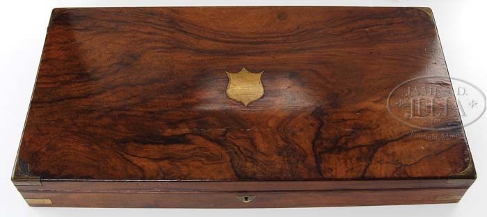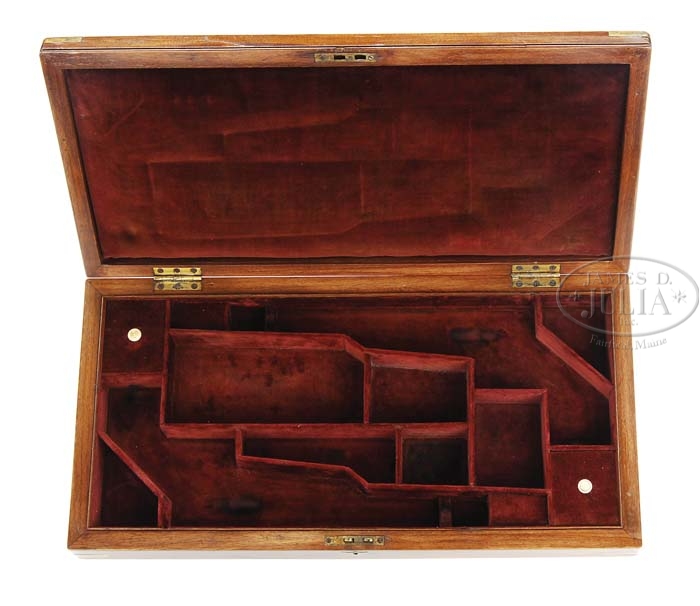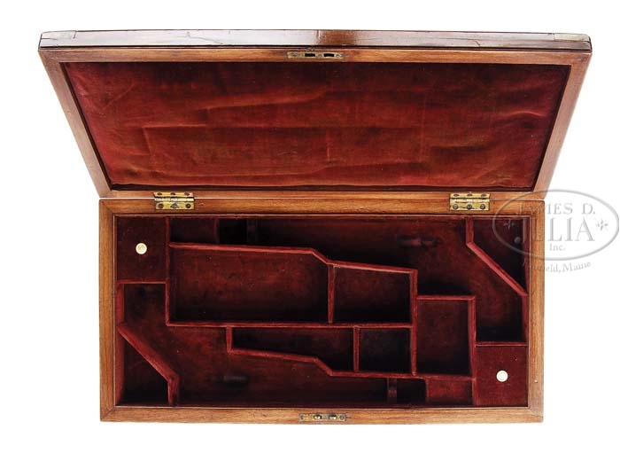 EXTREMELY RARE WALNUT CASING FOR A PAIR OF COLT MODEL 1860 ARMY REVOLVERS & ACCESSORIES. Extraordinarily rare dbl casing for Model 1860 Armys that measures 19-3/4″ long x 10″ wide x 2-4/8″ deep, made from French walnut with brass reinforced corners and an empty gilded brass shield in center of the lid. Front of case has a mortised brass lock with gilded shield escutcheon. Interior is burgundy velvet lined and compartmented, American-style, for two Colt Model 1860 Army revolvers with flask & mold compartments, corner compartments for cap tins and three additional compartments for cartridge packets and other implements. Right front & left rear corners have covered compartments with ivory pulls. Lid is English or Continental-style that holds itself open rather than American-style that lays flat when open. A rare opportunity to case your pair of ’60 Armies. CONDITION: Lid has a small series of grain checks with another in bottom, otherwise is completely sound and orig with light handling & storage marks and appears to have a wiped-on finish on lid. Interior does not appear to be faded and has light soil & light damage from front sights & hammer spurs from a pair of revolvers with all dividers sound. 4-38454 JR264 (15,000-25,000)