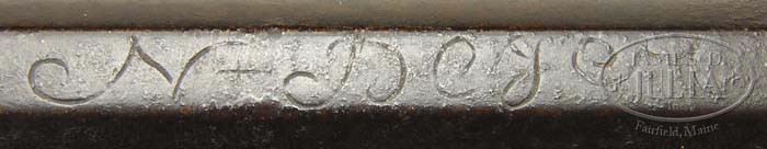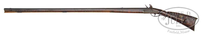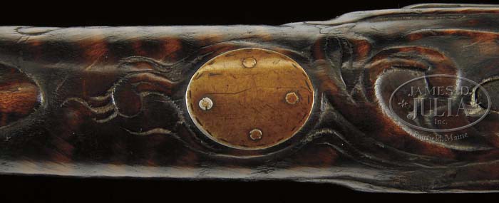 GOLDEN AGE SIGNED NICHOLAS BEYER CARVED FLINTLOCK RIFLE. This rifle has a 46-1/2″ inch oct to rnd smooth bore bbl signed in script by N. Beyer. The 4-pc brass engraved patch box is similar to rifle No. 93 in Kindig and the patch box latch is riveted in the upper corner of the lid with the release in the butt plate. The butt carving on the cheek piece side, silver cheek star and brass side plate are also identical to Kindig’s rifle No. 93. The relief carving at the tang is sharp and crisp and includes a rnd inlay secured by four pins. This is a clean, honest N. Beyer rifle in attic condition which has had no restoration. N. Beyer was one of the most prolific of the better rifle makers who worked as a gunsmith in Dauphin County circa 1807 – 1810. The ramrod pipes on this rifle are short with molded ends and the forward trigger guard extension ends with two fixed lines that form a molding. CONDITION: This is a clean, honest N. Beyer rifle in attic condition which has had no restoration and shows only signs of normal wear and use. The front bbl pin is missing and there are several losses of wood on both sides along the barrel and around bbl pins. There is an old period metal repair between the nose cap and the front ramrod pipe. A small bit of wood is missing over the front of the lock plate. 4-45183 RGG9 (20,000-30,000)