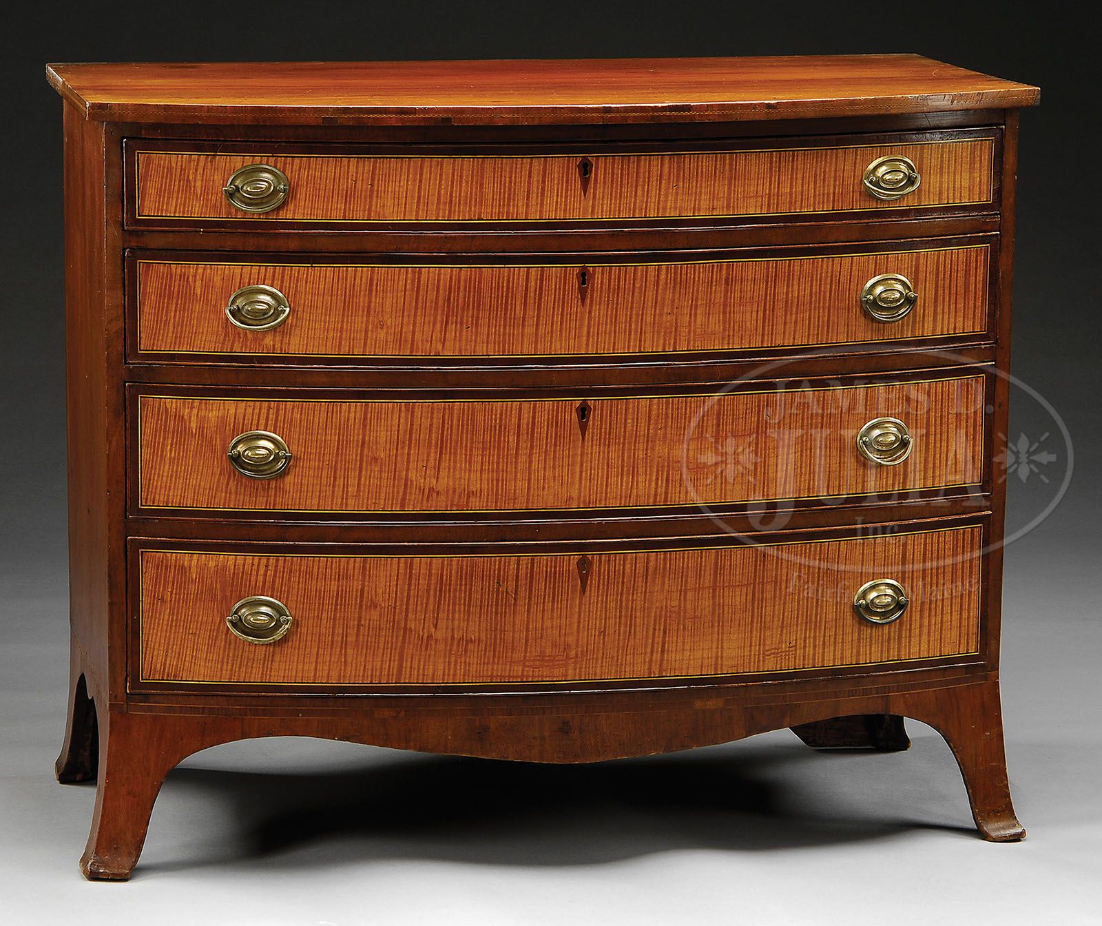 NEW ENGLAND FEDERAL INLAID MAHOGANY AND TIGER MAPLE CHEST OF DRAWERS. Early 19th century. The rectangular mahogany top with bowfront above the conforming case fitted with four long graduated drawers each with mahogany crossbanding, cockbeaded edges and tiger maple panels with string inlaid border with inlaid with shield escutcheons, raised on flaring French feet. SIZE: 33-1/2″ h x 41-1/2″ l x 23″ d. CONDITION: Professionally repolished, feet and backboards original. Antique, if not original, brasses. Proper left edge of top with old shallow burns. 9-27664 (4,000-6,000)