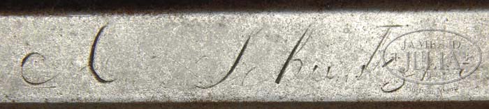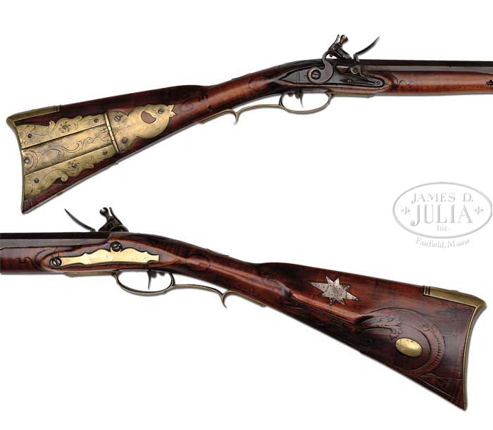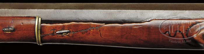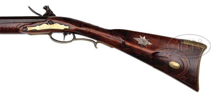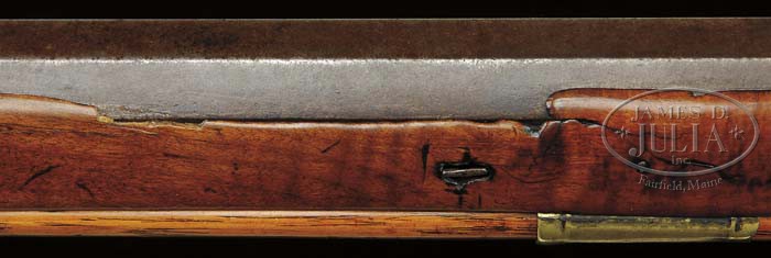 RARE EARLY FULL STOCK FLINTLOCK TAKE DOWN LANCASTER RIFLE SIGNED A. SCHWEITZER. This rifle has a 44″ full oct signed A. Schweitzer bbl and features the very desirable horse head patch box. The rifle is relief carved with the typical Lancaster school C-scrolls behind the cheek piece. There is additional carving at the wrist and around the bbl tang. The rifle retains its nice patina and there are a number of silver inlays including an eight-pointed hunters star on the cheek and an oval silver inlay incorporated into the relief carving behind the cheek piece. The fore stock was made in two sections, a rare variant in early rifles, to simplify take down and storage. Abraham Schweitzer (1769 – 1831) began work in Lancaster and is thought to have been associated with Henry Albright. Both Schweitzer and Albright are known to have produced guns on contract for the government in 1794. Schweitzer was married to the sister of Melchior Fordney and is thought to have moved to Chambersburg by 1796. The rifle is similar to rifle No. 226 in Kindig’s monumental work on the Kentucky rifle. CONDITION: Generally very good. There is a shrinkage repair using the orig wood at the toe. An old break through the stock just forward of the lock has been stabilized. There are some wood losses along the bbl forward of the lock before the take-down separation on both sides and also 18″ in front of the lock and over the forward ramrod pipe. There is a 7-1/2″ long loss of wood along the bbl on the side plate side. A truly high quality Schweitzer rifle. 4-45118 RGG11 (20,000-30,000)
