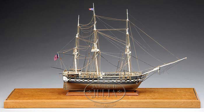 CASED SHIP MODEL OF THE U.S.S. “CONSTITUTION” WITH COMMEMORATIVE DOCUMENTS. Second quarter 20th century. The deck of planked wood construction and fully fitted with cannons, capstan, anchors, etc., the black and white hull with gold below the waterline. This commemorative model with document outlining a voyage in 1931-1934 of the then restored and re-commissioned U.S.S. Constitution. Now mounted on plinth within a custom brass and glass case. SIZE: MODEL: 21″ h. x 28″ l. x 9″ w. CASE: 27-1/2″ h. x 43″ l. x 10-1/2″ w. CONDITION: Very good overall. 9-93232 (3,000-4,000)