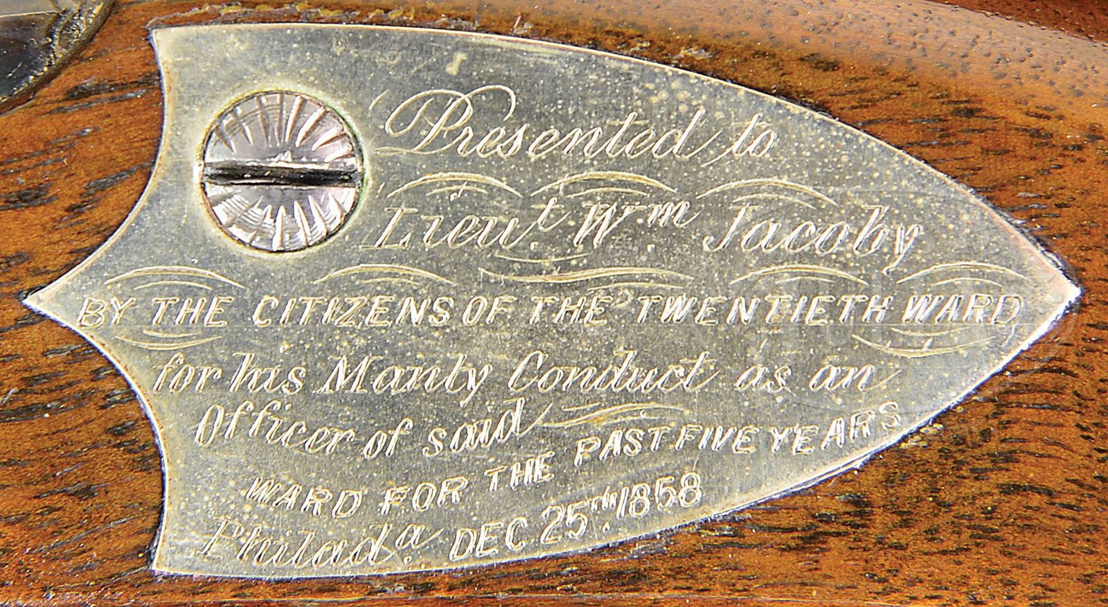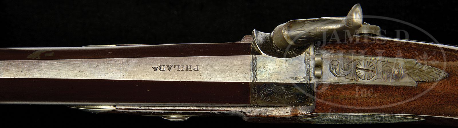 PRESENTATION CASED PAIR JOHN KRIDER PISTOLS. This might not be the highest grade set of Krider pistols known but it is no doubt the finest conditioned. These guns are like new in most every detail. Accompanying this pair is a silver medal presented to John Krider by the Franklin Institute of Philadelphia for his manufacture of guns in 1858, the same year as the gold presentation plaques on each of these pistols. These guns measure 8-3/4″ overall with 4-7/8″ bbls with bores measuring about 45 caliber. The inscription on each of these cased Krider’s reads “Presented to/Lieut Wm Jacoby/BY THE CITIZENS OF THE TWENTIETH WARD/for his Manly Conduct as an/Officer of the said/WARD FOR THE PAST FIVE YEARS/Philada DEC 25th 1858”. Lt. Jacoby, of the Philadelphia Police Department, had received another gun four years earlier, a Colt Model 1849. This pair of guns is pictured on pg 78 of Wilson & Eberhart The Deringer in America, 1985. This pair is also pictured in the February 1971 Pennsylvania gun collector’s Monthly Bugle. PROVENANCE: Hal DuPont collection; Ray Petry collection; Dave Stewart collection. CONDITION: Guns are excellent overall. Bbls retaining 98%+ orig bright brown. Locks, hammers and breeches retain about 50% bright case colors with balance muted and German silver mountings are fine and well fit. Stocks retain 90%+ orig varnish with just a couple small handling nicks and scuffs. Accompanying mahogany case with red velvet lining is fine overall though lid is slightly warped. Franklin Institute silver medal is 2″ in diameter and in excellent condition, still retaining much of its orig luster. 4-49616 JS27 (30,000-50,000)