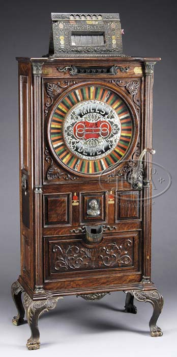 MILLS “TWO-BIT” DEWEY UPRIGHT SLOT MACHINE. Patented in 1898, the Dewey was produced by Mills for 20+ years. Truly one of the most mechanically reliable and attractive of the Mills upright slot machines. A quarter, or up to six quarters, could be played. If all six slots were selected, you were guaranteed a winner. Rewards would be anywhere from fifty cents to five dollars. Overall a very fine all original condition Mills Dewey with the early style cabinet. The quartersawn cabinet retains its original finish and the iron castings retain their original blackened copper finish as well. The lithographed tin wheel is more aesthetically pleasing than the normal wheel found on Deweys. This particular wheel is known as the “pie wedge” wheel. Unusual to find any upright in untouched all-original condition, a smaller side panel door that gave access to the cash bag has unfortunately been lost and replaced. SIZE: 66″ h. CONDITION: Overall very fine. Front coin cover casting has chip out of upper left corner and an old repaired crack to right side to the same panel. Interior shows original Mills paper label detailing date of manufacture, inspector, etc. Comes with original locks and keys. 1-10597 (15,000-20,000) Auction: Advertising, Toy & Doll - Spring 2011 Please Note: All prices include the hammer price plus the buyer’s premium, which is paid by the buyer as part of the purchase price. The prices noted here after the auction are considered unofficial and do not become official until after the 46th day. |