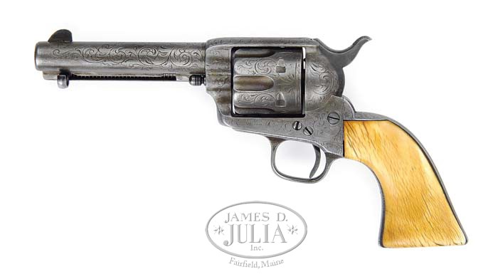 Additional Information: Serial number indicates 1876 production date. VERY EARLY ENGRAVED COLT SINGLE ACTION ARMY REVOLVER. SN 23871. Cal. 45 Colt. Scarce engraved early single action with 4-3/4″ bbl, apparently reduced to this length during period of use. It has 1-line block letter address with a relocated front sight with engraving patterns. It has 1-pc very mellow, worn ivory grip. Overall it has about 70% coverage New York-style foliate arabesque pattern engraving with feather patterns on top strap, all with punch dot background, possibly from the Nimschke shop. Ejector rod housing has feather patterns also and cylinder with arabesque patterns on lands between flutes with small sunburst at back of each flute. CONDITION: Fair, all matching with bbl & cylinder also numbered. No orig finish remains being a worn, cleaned metal color. Base pin screw has been altered with a larger threaded hole drilled vertically and a commensurately larger screw. Grip is somewhat shrunken and retains a beautiful mellow golden ivory patina with numerous age lines. Hammer & base pin are old replacements. Hammer will not hold in safety or half cock notches, otherwise mechanics are fine. Worn dark bore 4-35441 (8,000-9,000)
