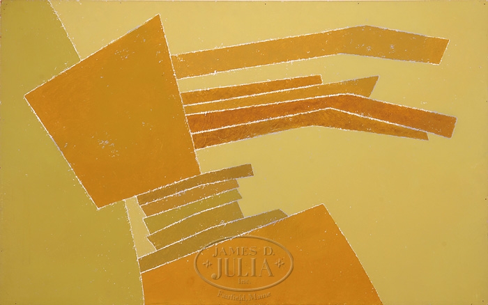 LEE GATCH JR.(AMERICAN, 1902-1968) ABSTRACTION IN GOLD. Oil on board abstract scene shows geometric shapes in shades of gold against a yellow-gold background. Unframed but mounted to a wood stretcher. Unsigned front but signed on reverse in bold, black letters, “GATCH”. SIZE: 30″ x 48″. CONDITION: Very good. 9-97134 (2,000-3,000)