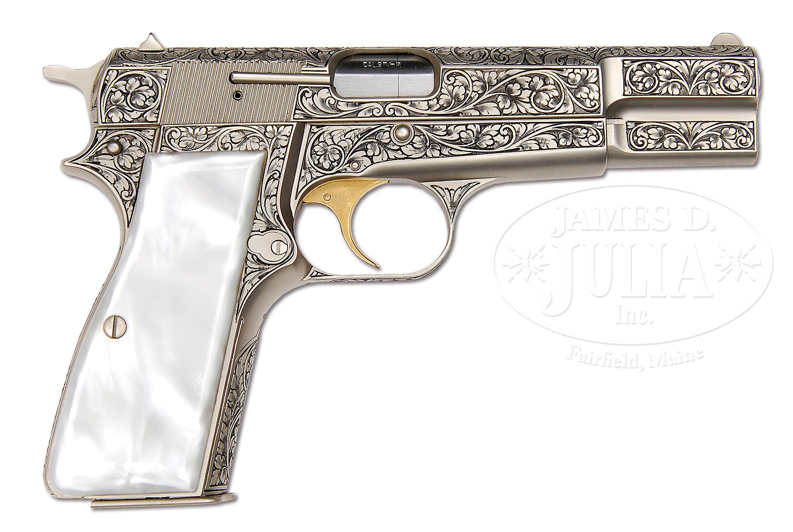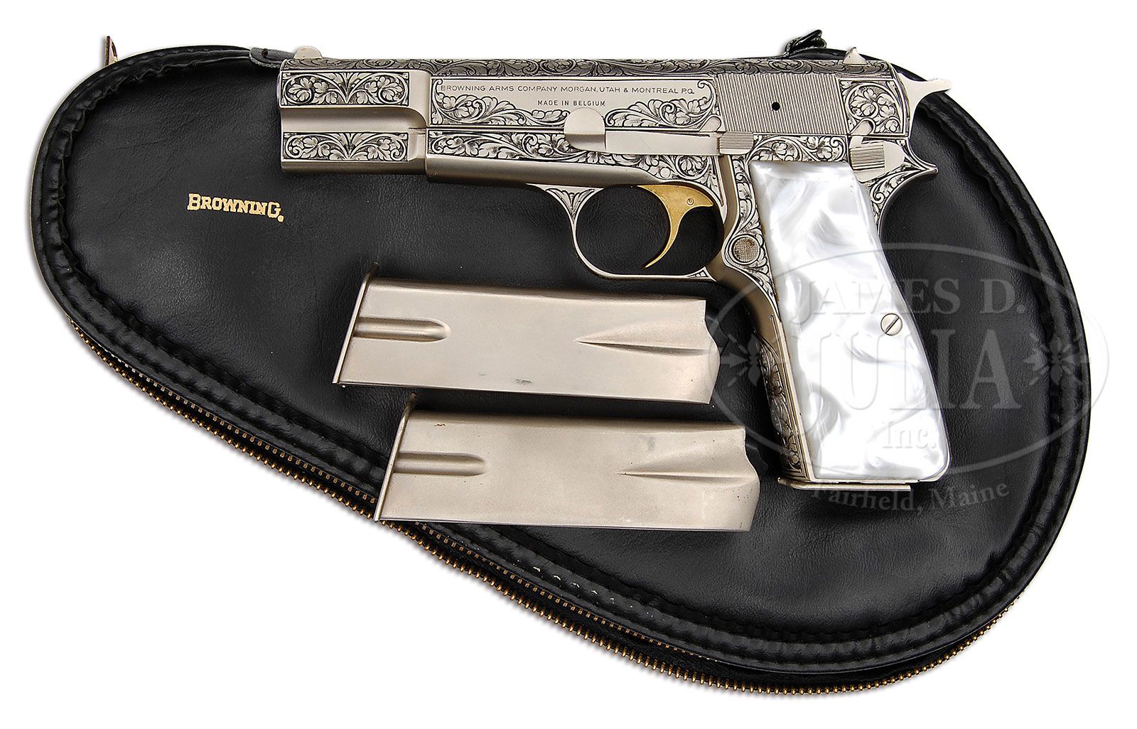*SCARCE BROWNING RENAISSANCE HIGH POWER SEMI-AUTO PISTOL THAT BELONGED TO FRANK SINATRA. SN 75C59812. Cal 9mm Luger. French grey finish with 4-3/4″ bbl, fixed sights and faux pearl grips. It has a gold trigger and is accompanied by 3 orig Browning 13-rd magazines. Also accompanied by its orig Browning black vinyl zipper rug with Browning embossed in gold on the outside and a high power owners manual. This pistol was gifted by Mr. Sinatra to Mr. Henry (Hank) Cattaneo. Mr. Cattaneo has provided an notarized letter wherein he states that he began working as Mr. Sinatra’s production manager in about 1980, culminating in Mr. Cattaneo’s co-producing Mr. Sinatra’s last 3 musical albums. He states that they had a mutual interest in collecting toy trains and firearms. He further states that Mr. Sinatra toured exclusively by private jet, most often accompanied by his longtime housekeeper, Ms. Vine Jourber, not only was she his personal assistant she was also his private chef. He states that on arriving at “one of the theatrical venues in the Metro area (NY, CT, NJ) Frank said: ‘Vine needs you’. It was Vine who presented me with the box and said: ‘Frank wants you to have this’.” He states that this pistol was in the carton. A rare and unique opportunity to own a firearm from a very famous singer, movie star and actor. PROVENANCE: Frank Sinatra; Mr. Henry Cattaneo CONDITION: Extremely fine plus. Has been fired, but very little. Overall retains 99% plus orig finish. Spare magazines are equally new. 4-48262 JR385 (2,500-4,000)