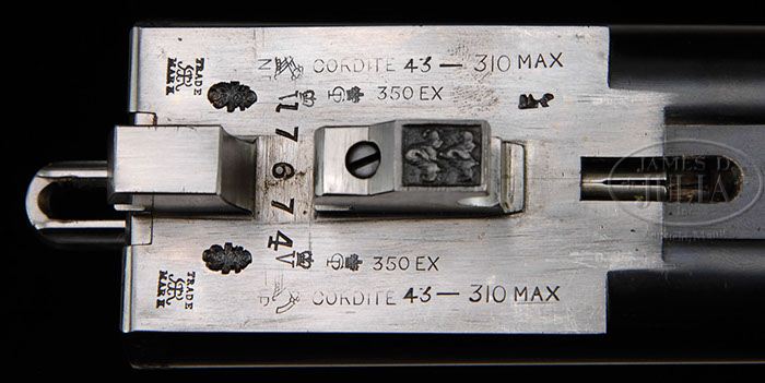 *TRULY EXCEPTIONAL FULL RELIEF ENGRAVED J. RIGBY RISING BITE DOUBLE RIFLE FOR H.H. MOHAMMED NASRULLAH KAHN. SN 17674. Cal. .350 Rigby (400/350 Express). 26″ chopper lump bbls with file cut quarter rib fitted with one standing, two folding platinum lined leaf express sight marked for 100, 200, and 300 yards. Broad mid rib is inlaid in gold “John Rigby & Co. 43 Sackville Street. London. W.” Silver bead front sight is longitudinally dovetailed into nicely filed and stippled ramp base. A broad sling loop is soldered to bottom of bbl set. Bbl flats are stamped with SN, Rigby “RR” trademark, and London nitro proofs for 350 express, 43 grains cordite and 310 grain bullet. Tops of bbls are engraved “Special 350 Bore Rifle” and “For Special Cordite Cartridges. 310 grn. Bullet”. Case hardened sidelock action features automatic safety fitted with push button bolt (SAFE inlaid in gold), bushed strikers, Rigby’s signature rising bite third fastener, and double triggers. Other typical Rigby features are the “dipped” lockplates, broad screw slots, and trigger guard bow which attaches fore and aft to extended trigger plate. Action is engraved with truly exceptional quality and highly unusual deep chiseled, full relief scrolled acanthus with floral highlights and finely stippled background. Factory letter indicates that this fine work was done by Hayes. (Previous owners note indicates that his further research finds that this was misread, and should be Haynes.) “John Rigby & Co.” is inlaid in gold on raised, scrolled riband on each lockplate. SN is relief inlaid on trigger plate extension. Trigger blades are gold washed. Rifle is also fitted with Rigby’s unique ejector system, with hexagonal nut which can be adjusted to make ejectors become extractors. Beautifully flame figured and nicely marbled Circassian walnut full horn capped pistol grip buttstock measures 14-1/2″ over Silver type pad. Stock features attenuated drop points, point pattern checkering with mullered borders, and orig relief engraved steel button set at rear of toe line to attach sling. Matching splinter ejector forend has pivoting lever release bolt, which is also deeply acanthus engraved, and marked “Rigby’s Patent”. Drop at heel: Approx 2-1/2″, drop at comb: Approx 1-11/16″. Weight: 9 lbs. 3 oz, LOP 14-1/2″. Makers oak and tan leather case has brass corners. Top of case is embossed “H. H. Maharaja Holkar”. His Highness Mohammed Nasrullah Khan is not the Maharajah of Holkar. The case was likely mated to the rifle at a later date. The lower left corner is embossed “.350 Double”. Interior is lined in burgundy cloth with large paper Rigby label. Compartments hold 2-pc beech and brass cleaning rod, pair of ivory handled turnscrews, Rigby marked crystal oil bottle, pair of snap caps, horn striker block, bone striker bottle containing spare front sight and screw, as well as two boxes of Kynoch 400/ 350 cartridges with yellow labels. This special rifle, made in 1912, for His Highness Mohammed Nasrullah Khan, of the Indian muslim 19-gun princely state of Bhopal. He was the eldest son of the legendary Begum of Bhopal, but missed out on taking over as ruler of the state in favor of his younger brother under the 1926 Bhopal Succession Act promulgated by his mother the Begum of Bhopal. Nawab Muhammad Nasrulah Khan was born on 3 December 1876 and would have been 36 at the time of ordering/delivery this rifle. It is said that he was a prolific Tiger hunter with over 130 kills to his credit. PROVENANCE: Letter from Rigby with engravers information, and that it was made for “H.H. Mohd Nasrula Khan”. Info about the Maharaja, and previous owners notes on rifle. CONDITION: Excellent. Bbls retain nearly all of a very professional London quality re-blue. Action retains approx 90% orig case hardening color with edges and high points of engraving silvered to very pleasing effect. Stocks retain nearly all of their orig rubbed oil finish with a few minor handling knocks and dings. Checkering is slightly worn, with a number of missing diamonds near base of lever release. Bores are excellent, with bright, sharp rifling throughout, with the slightest hint of erosion in throat of right bbl. Action is tight. Bbls are on face. Ejectors are slightly out of time. Case leather is very fine, retaining nearly all of its orig color, with a few minor scuffs and marks. Orig caliber has been taken out and “350” added in. This case was likely originally for a larger (450 or 470) rifle. Handle and straps are fine. Interior cloth is good, with some rubs and soiling. A number of blocks in bbl channel are missing. Ivory handles of turnscrews are cracked, but otherwise fine, as are other accessories. Undoubtedly one of the finest Rigby rifles in existence. 4-45684 MGM27 (40,000-60,000)
