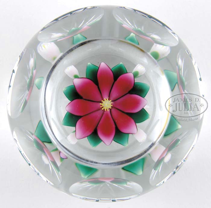 BOBBIE BANFORD FLORAL PAPERWEIGHT. An eight petaled pink flower blossom with four buds and green leaves rests on a clear ground. Fourteen side facets and one top facet, star cut base and signed with a “B” signature cane on underside. SIZE: 2-1/8″ dia x 1-5/8″ t. PROVENANCE: Barry Schultheiss Collection. CONDITION: Very good to excellent. 5-63353 (200-400)