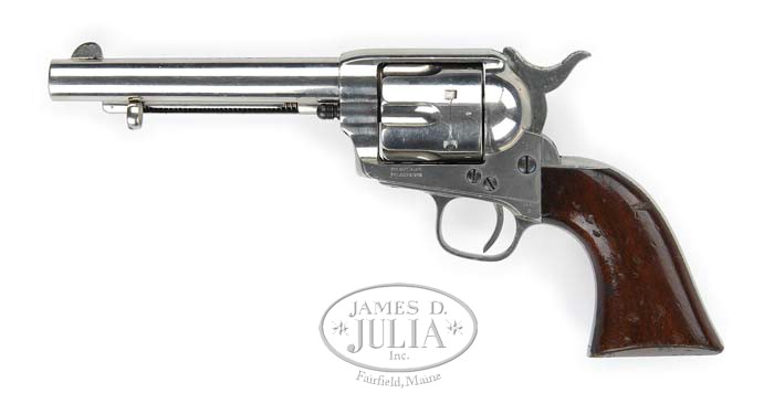 COLT HARTFORD/LONDON SINGLE ACTION ARMY REVOLVER. SN 15247. Cal. 45 Eley short. Nickel finish with 5-1/2″ bbl, full front sight, with 1 line script letter address with seraphs at each end. It has 1st type ejector rod housing with bullseye ejector rod head. The last 4 digits of the serial number are on the bbl underneath the ejector rod housing and on the cylinder. It has its orig early style base pin with dimples at each end. The left side of the frame has small letter 2 line patten dates with the caliber marking on the left shoulder of the trigger guard, “45 CAL/B”, with small English proofs on the bbl and cylinder. It is mounted with varnished, 1-pc walnut grip with the last 4 digits of the serial number in ink in the backstrap channel. It has the 1st type hammer spring w/out grove and the hammer has the short, coarse checkering. Accompanied by a Colt factory letter identifying this revolver in caliber as noted, nickel finish with bbl length and type of stocks not listed, shipped to Colt’s London agency on January 14, 1875 in a shipment of 3 same type guns. According to the Colt Peacemaker Encyclopedia, Cochran, of the 357,859 single actions produced only 818 were produced in 450 Boxer and only 1,563 were produced in 455 Eley. These cartridges were basically interchangeable and produced in approximately the same time frame. CONDITION: Extremely fine. Overall retains virtually all of its strong bright orig nickel with some fine pimpling on the right side of the frame and one area on the cylinder with the front and backstraps slightly dulled. Screws retained most of their orig, slightly thinned, factory blue. Hammer does not have a half-cock notch and 3 chambers on the star wheel need adjustment as the hand will not engage. The other 3 notches on the star wheel function fine. Otherwise mechanics are fine. Grip has slightly chipped toes with some minor bruises and scrapes and retains about 95% strong orig varnish. Bright shiny bore. 4-35515 (8,000-12,000)