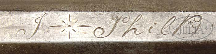SIGNED LEBANON COUNTY JACOB PHILIPY SMOOTH RIFLE. This rifle has a 42″ oct to rnd .54 cal smooth bore bbl that is signed in script J. Philipy. Jacob Philipy (Philipee) is listed as having worked in Lebanon County in 1842. The bbl is fixed to the stock with four bbl wedges and the Maple stock has an wonderfully hand-grained red violin finish. The engraved 4-pc brass patch box is of the Bonewitz style and the rifle has a nice Roman nose profile. CONDITION: Much of the orig finish remains. This rifle is in nice attic condition throughout having only one small 2-3/8″ x 3/16″ period wood repair on the lock side of the trigger guard finial. The late English flint lock is a reconversion. The patch box release spring is loose and should be properly reset. 4-45155 RGG2 (6,000-8,000)
