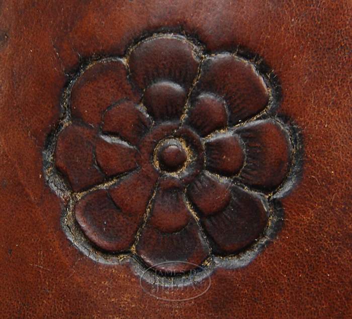 RARE DELUXE F.A. MEANEA BELT & HOLSTER RIG. Wonderful deluxe rig with 39” x 3-3/8” deluxe Meanea cartridge/money belt with scalloped billets and a rectangular cut corner iron buckle. Tongue billet is marked “F.A. MEANEA / CHEYENNE” at tip. Belt is 1-pc soft, supple, russet leather folded over top and sewn with thirty-seven 44/45 sewn on cartridge loops with small rosettes at each end. It also has a beautiful scalloped cartridge stop band of decorated thick leather sewn below cartridge loops. Accompanied by an equally beautiful dbl loop F.A. Meanea left hand holster for 7-1/2” sgl action revolver. It is made from one piece of medium weight leather sewn on back edge with a Cheyenne plug in toe. Face of holster has three incised lines around body with small rosettes stamped at each intersecting point. Top strap has four incised lines with light decorations and a rosette at each end. Bottom band has a sgl incised line on edges with Meanea’s cartouche “F.A. MEANEA, / CHEYENNE, WYO.” CONDITION: Belt has a moderately crackled surface but remains mostly soft & supple with most of its orig finish. There is a small tear on bottom, about 5” from buckle end. Inside has a couple of heavier cracks in leather. Holster, while having been carried, shows little wear on outside, although rough side of skirt shows substantial wear. There is some minor dryness & crackling at ends of loops. 4-33499 JR325 (12,500-17,500)