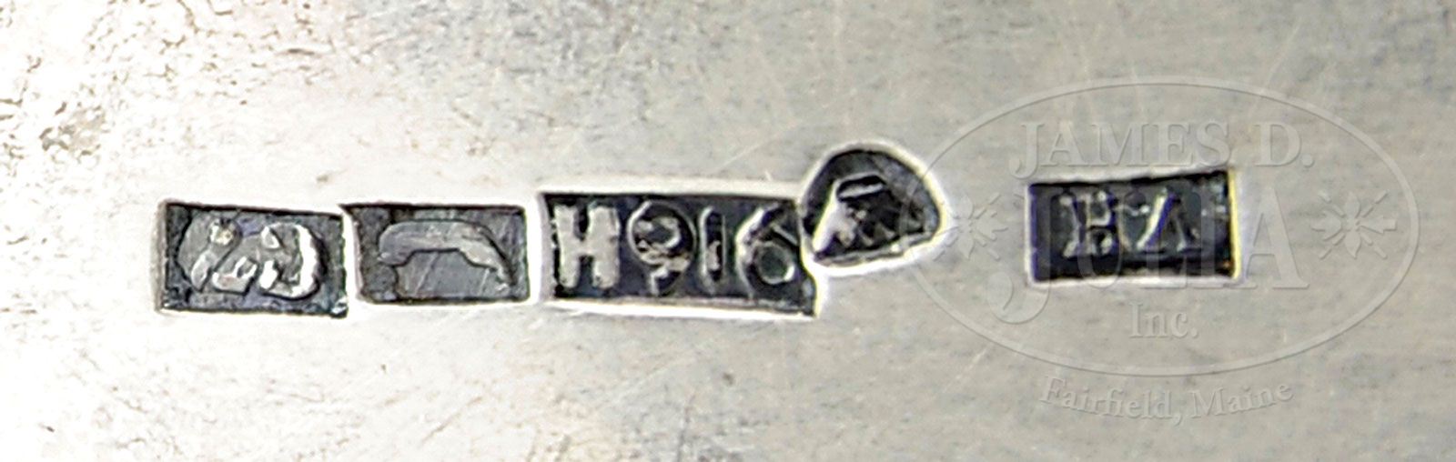 INTERESTING STERLING FOOTED DISH. The modern designed dish having 3 cone shaped feet, round bowl with upswept scrolled handle. Hallmarked on bottom Helsinki (boat), Finland 1956 (C7), 935/1000 (916 H), Silver (crown), maker (VH). WEIGHT: 4 troy ounces. SIZE: 5″ h x 5″ l x 4-1/4″ d. CONDITION: Very good. 9-27201 (300-500)