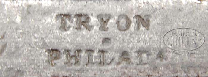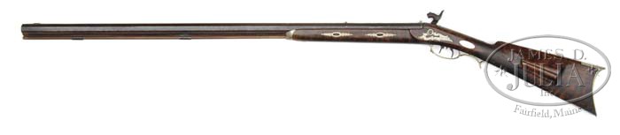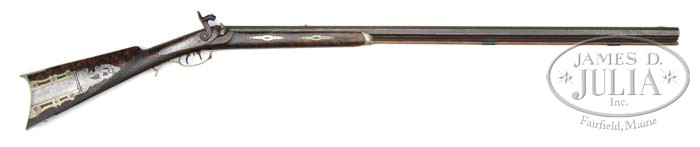 TRYON (PHILADELPHIA) SILVER MOUNTED PERCUSSION HALF STOCK SQUIRREL RIFLE. SN NSN. Cal. 34. 36″ Octagonal barrel with 24″ under rib, is fitted with two plain pipes holding plain hickory ramrod. Bbl is fitted with brass front and iron V-notch rear sights. Top flat is stamped “TRYON * PHILADa”. Patent breech has gold and silver band at rear. Back action lock is stamped “Ashmore & Son”, and is scroll and game scene engraved, mounting plain flat-faced serpentine hammer. Birdseye maple stock is mounted with a combination of silver, German silver, and iron furniture. Crescent buttplate with iron return and trigger guard with spur are of nicely engraved German silver. Hinged patchbox lid with pierced floral finial are of iron, and has classically shaped pierced German silver side panels. Nicely engraved and pierced sideplate is of silver, as are matching escutcheons holding two broad side nails. Forend cap also appears to be of silver. There are two oval escutcheon plates, one on toe line, the other on left side which is punch-dot engraved “Joseph Grath” (?). CONDITION: Fair to good. Bbl is chocolate brown patina overall. Extra dovetail slot is filled with brass, and some vise marks are at breech. Lock is cleaned to silver brown, as are iron parts of furniture. German silver is toned nicely, silver still nicely bright. Stock retains an old oil finish with some care taken to preserve edges and details. There is a crack on right side running from in front of trigger guard bow, up through rear of escutcheon plate and on to bbl, which has been repaired, and does not flex. Bore is good. Rifling is strong, should clean. Lock catches at half cock. Hammer is loose on tumbler. 4-44924 MGM180 (2,000-3,000)