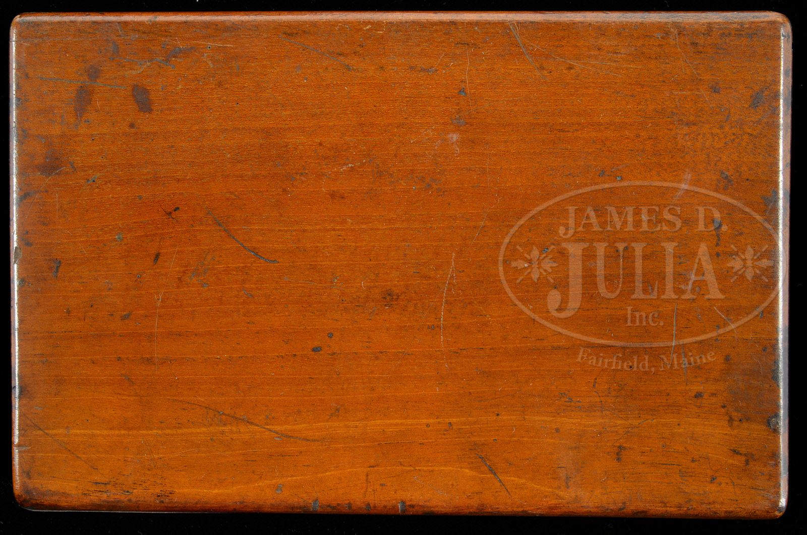 SCARCE CASED ROBBINS & LAWRENCE SAW-HANDLE PEPPER BOX. SN 3536. Cal. 31. Scarce 5-shot percussion pepper box with 3-5/8″ bbl cluster, pinched post front sight and groove rear sight in the barrel latch. It has ring trigger with concealed rotating hammer and is mounted with 2-pc smooth ivory grips that are matching numbered to this pistol. Frame is octagonal shaped around the breech area with a saw-handle shaped rear frame and a button safety in the back strap. Frame is beautifully engraved, probably by L.D. Nimschke, with intricately intertwined foliate patterns that have an extremely fine punch-dot or pearled background. Top of the rear frame has a game scene engraved panel of a standing bull elk, and the back strap is engraved in a twisted rope pattern with a fine rosette around the safety button. Rear edge of the frame and around the edge of the bbl latch slot is engraved with dbl chip borders. Octagonal section is engraved in alternating diamond & dot and zig zag & snake patterns. Breech end of bbl cluster & web of trigger are engraved in foliate arabesque patterns. Accompanied by an original purple velvet lined mahogany casing, compartmented in the bottom for the pistol, an orig Robbins & Lawrence tiny bag flask, two orig Robbins & Lawrence ball molds, one sgl ball and the other two balls and a lacquered tin of caps. Case is missing one end of the lid. CONDITION: Very good to fine, all matching. No orig finish remains, being a cleaned grey metal patina with a few spots of discoloration and a couple nicks on the barrels. Hinge is slightly loose otherwise mechanics are fine. Grips have a few age lines and are solid, retaining a wonderful ivory patina. Case lid is slightly warped, missing an end of the lid, as noted. Bottom has a couple of grain checks otherwise case is sound with light handling & storage nicks & scratches. Interior is lightly faded in the lid and lightly to moderately faded in the bottom, with moderate soil. Flask has a dent near the bottom and traces of orig finish. Molds and cap tin are fine. 4-48119 JR278 (3,000-5,000)