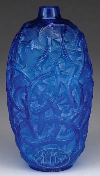 R. LALIQUE BLUE VASE. In the Ronces pattern with fiery sapphire blue color and original whitish patina in the recesses. Impressed block signature in the mold “R. Lalique” together with the remnants of the original retailer’s sticker “The VASE SHOP”. SIZE: 9” t. CONDITION: Very good to excellent. 5-68513 (6,500-8,500)