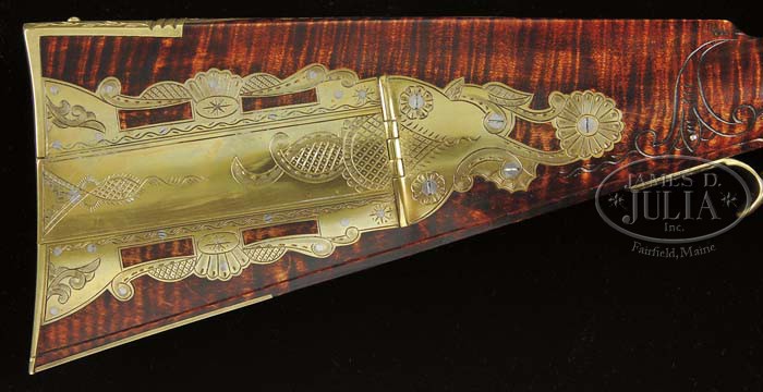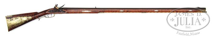 DON DAVISON CONTEMPORARY KENTUCKY RIFLE. SN NSN. Cal. .45. 44″ Swamped octagonal barrel has some large open scroll engraving on top rib flanking German silver blade front, and U-notch open buck horn rear sight. Rear portion is engraved “* D. R. Davison *”. Bbl has removable stainless steel touch hole. Nice quality Siler lock with removable faceted pan and bridled friction frizzen has spring nicely file decorated. Lockplate with pointed rebated tail is mounted with serpentine cock, and has simple engraving. Trigger plate is fitted with double set triggers. Beautifully fiddle figured, dark red stained, full length maple stock is brass and German silver mounted. Stock mounts to bbl with four pins through engraved oval German silver escutcheons. Faceted brass pipes hold stripe decorated hickory ramrod with brass tip. Trigger guard and buttplate are also of brass, as is sideplate. All are engraved matching theme of remainder of gun. All parts are expertly inlet. Buttplate has long foliate extension over comb, and rectangular return at toe. Rectangular patchbox with button release at top of buttplate has finely inlet pierced flaking plates, and pierced scrolled finial with floral top. Stock has incised scroll carving. A right hand molded cheekpiece has vent pick mounted in keeper underneath. An 8-point elongated German silver star is above cheekpiece. CONDITION: Essentially as new. Cock holds a piece of maple instead of flint. Frizzen appears unstruck. Bore is excellent. A contemporary Kentucky that is obviously the work of a talented craftsman, taking hundreds of hours to complete. 4-44181 MGM177 (2,500-4,000)