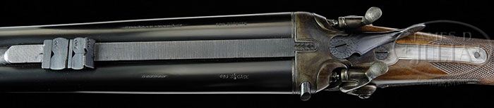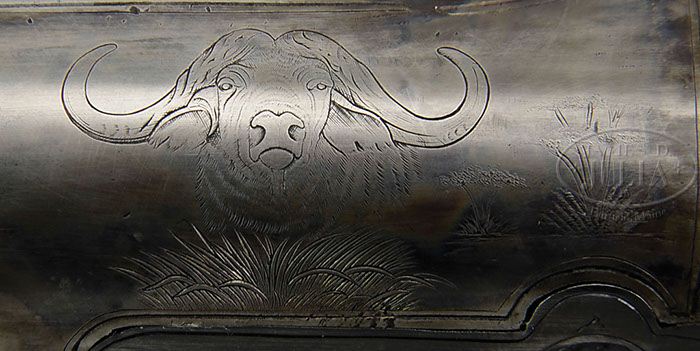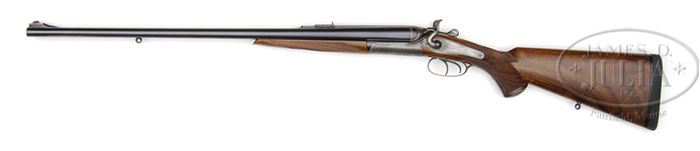 *CHARLES OSBORNE DANGEROUS GAME HAMMER DOUBLE RIFLE. SN 79101. Cal. .470 Nitro Express. 26″ Chopper lump bbls fitted with matted quarter rib, mounted with one standing, two folding leaf express rear sight, are engraved “Chas Osborne & Co” and “London” as well as “For Cordite” and “.470 3-1/4 Case” on tops, and have silver bead front sight dovetailed through nicely shaped ramp. A large sling eye is soldered to bottom rib. Well filed round bar top lever action with crossbolt third fastener, has peninsula back action locks, having round bodied serpentine hammers. Action, lockplates and hammers are line border engraved and have “Chas Osborne & Co” in scrolled ribands on each lockplate. Very finely engraved realistic ghostlike portraits of a buffalo and an elephant are on either side of action. Trigger guard with SN on tang extends to dome shaped steel grip cap. Nicely marbled European walnut full pistol grip buttstock measures 15″ over black “Decelerator” pad, and features point pattern checkering and a sling eye matching that on bbl, on toe line. Matching splinter forend with inlet steel tip has spring roller catch. Drop at heel: approx 2″, drop at comb: approx 1-5/8″. Weight: 10 lbs. 15 oz, LOP 15″. CONDITION: Excellent, as refurbished. Bbls retain nearly all fine satin re-blue. Action and lockplates retain most of a lightly colored re-hardening, silvered considerably on lock tails and top tang. Top lever is silvered at thumbpiece. Blue of trigger guard is thinning at grip. Newly made stocks retain nearly all of their fine satin finish with a few minor marks. Bores are very fine, with strong rifling throughout, frosted at breech ends. Action is just a hair loose. Bbls are slightly off face. Locks are crisp. Many African hunters liked hammer guns because of the absolute silence with which they could be operated. 4-46782 MGM206 (10,000-15,000)