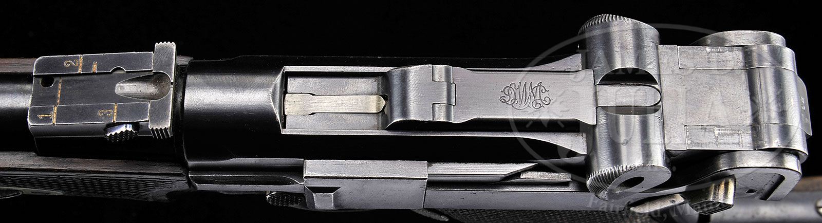 *MODEL 1902 LUGER CARBINE WITH STOCK. SN 23462. Cal. 7.65 mm. 11-3/4″ Bbl. Standard configuration with sleeved-on rear sight, integral front ramp, grip safety, and early style dished toggles. All numbers on carbine match. Grips and accelerator are unnumbered. Comes with correct type early unnumbered magazine with wood base plug, stamped with “flaming bomb” proof. Correct type checkered shoulder stock of lightly figured walnut with horn buttplate, is numbered “992” on attaching iron. PROVENANCE: Ralph Merrill Collection CONDITION: Excellent. Metal parts retain 85 – 90% orig blue with some light freckling, and silvered sharp edges. Strawed parts retain most of their straw. Grips show considerable wear. Grip screws retain a considerable amount of their orig temper blue. Bore is very fine, slightly frosted in grooves. Hex head machine screw is in drilled and tapped hole in rear of frame, (purpose unknown). Shoulder stock is in comparable condition to carbine, with a number of light marks and compressions in its orig finish. Takedown latch is silver. A good representative example of this important Luger variation. 4-47307 MGM76 (7,500-15,000)